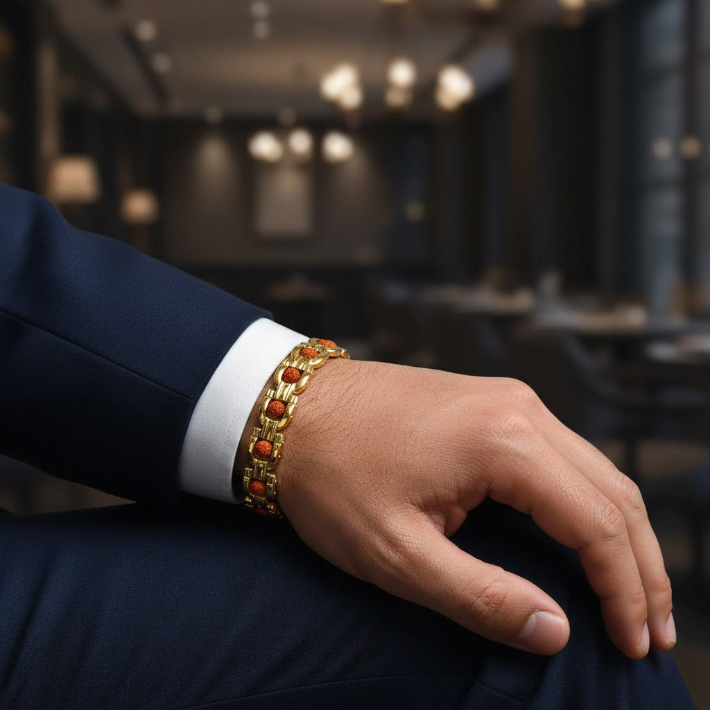 About Product: This Rudraksha Gold Plated Bracelet is a harmonious blend of spiritual tradition and refined elegance, crafted using natural Rudraksha beads combined with a rich gold IGP (Ion Gold Plating) finish. The advanced IGP coating enhances durability, resists tarnishing, and ensures a long-lasting radiant gold shine, making the bracelet suitable for both spiritual and daily wear.