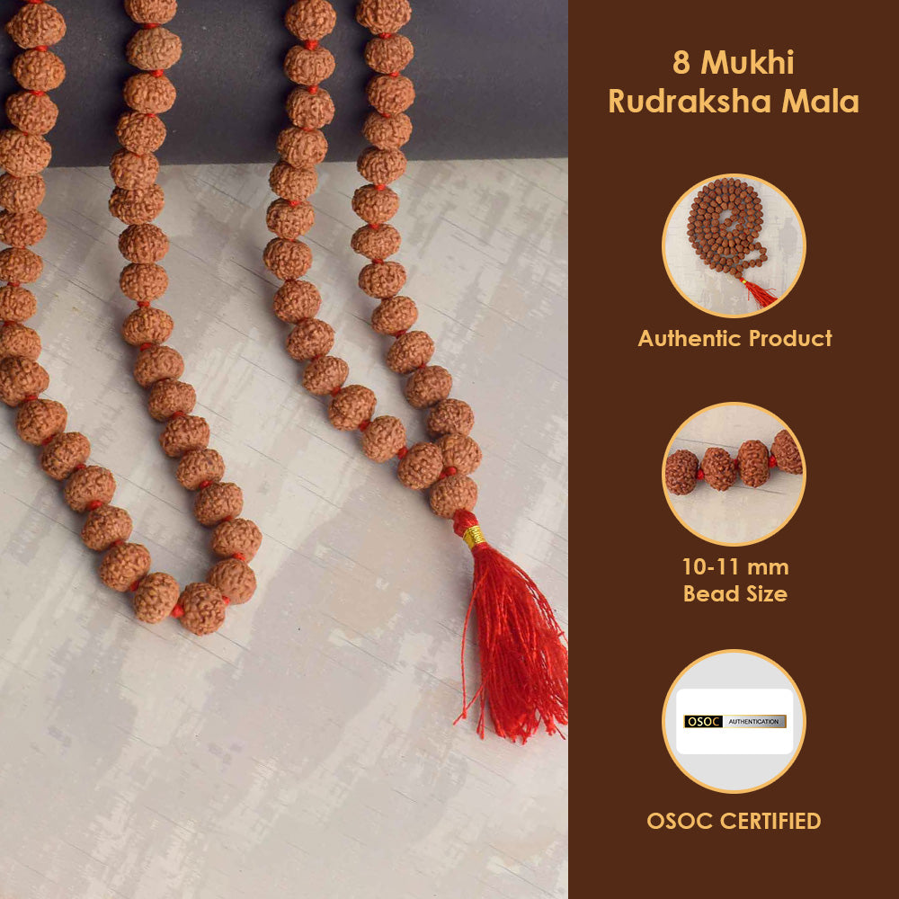 About Productย The 8 Mukhi Rudraksha Mala is a spiritually charged garland made from genuine Rudraksha beads, each with eight natural faces, representing Lord Ganesha โ€“ the remover of obstacles and the god of success. This powerful mala is ideal for those facing challenges in career, business, or personal life.