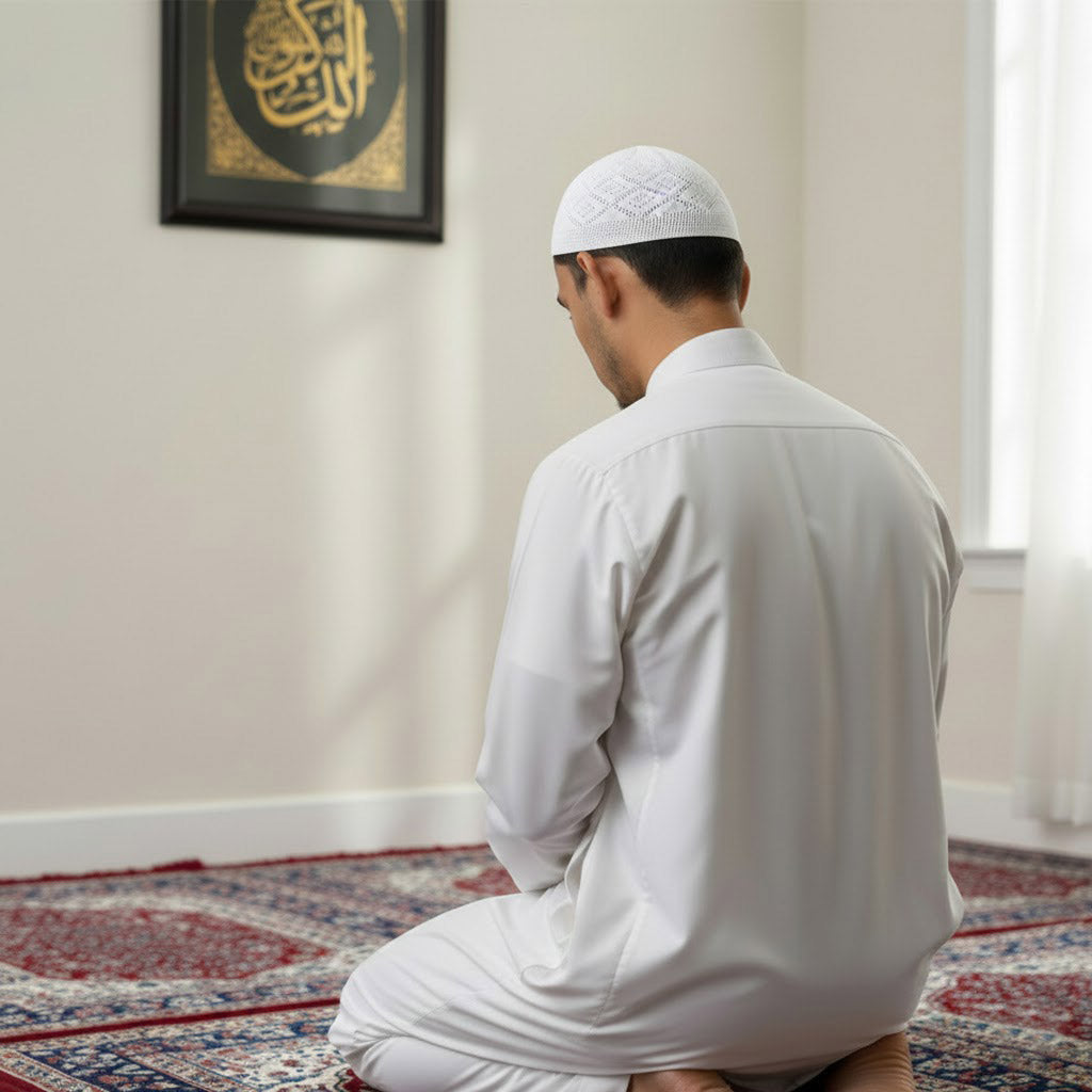 Wearing a Muslim cap during prayer symbolizes modesty, discipline, and spiritual focus, helping devotees maintain concentration and reverence while offering Salah.