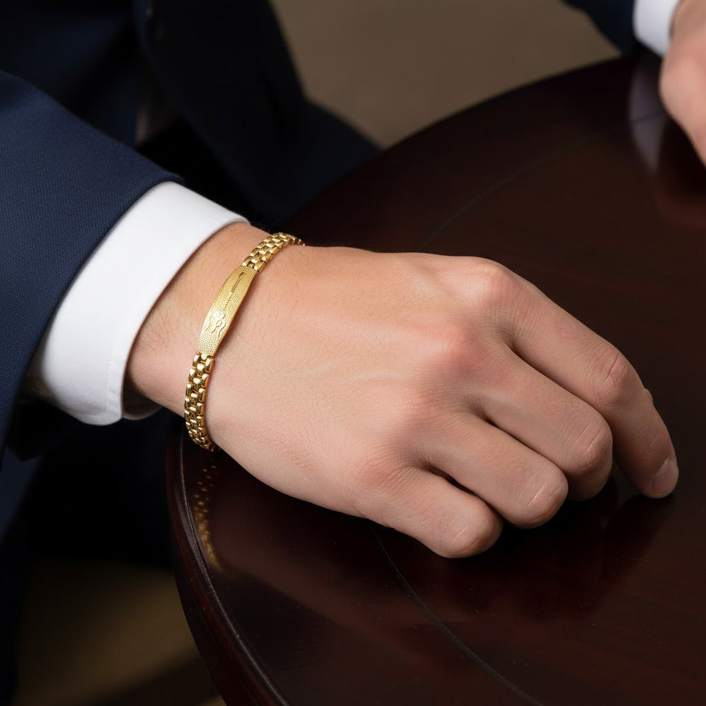 About Product: This Gold Plated Trishul Bracelet is a powerful symbol of strength, protection, and divine energy, crafted with a finely detailed Trishul (Trident) and finished with premium IGP (Ion Gold Plating) coating. The advanced IGP process enhances durability, resists tarnishing, and ensures a long-lasting rich gold shine.