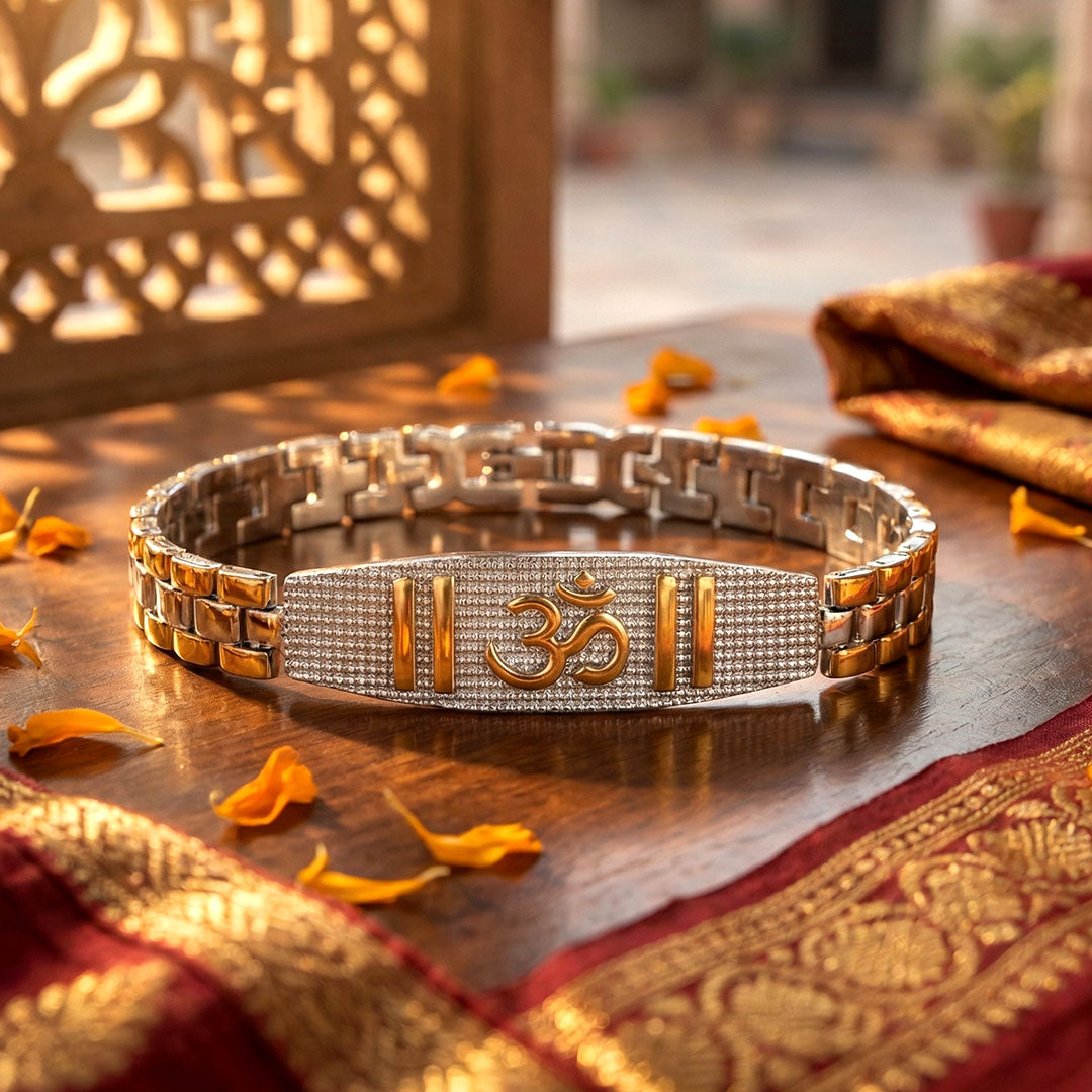 About Product: This Om Gold and Silver Plated Bracelet beautifully combines spiritual significance with elegant dual-tone craftsmanship, featuring the sacred Om (ॐ) symbol finished in refined gold and silver IGP (Ion Gold Plating) coating. The advanced IGP process enhances durability, offers resistance against tarnishing, and ensures a long-lasting radiant dual-tone shine.