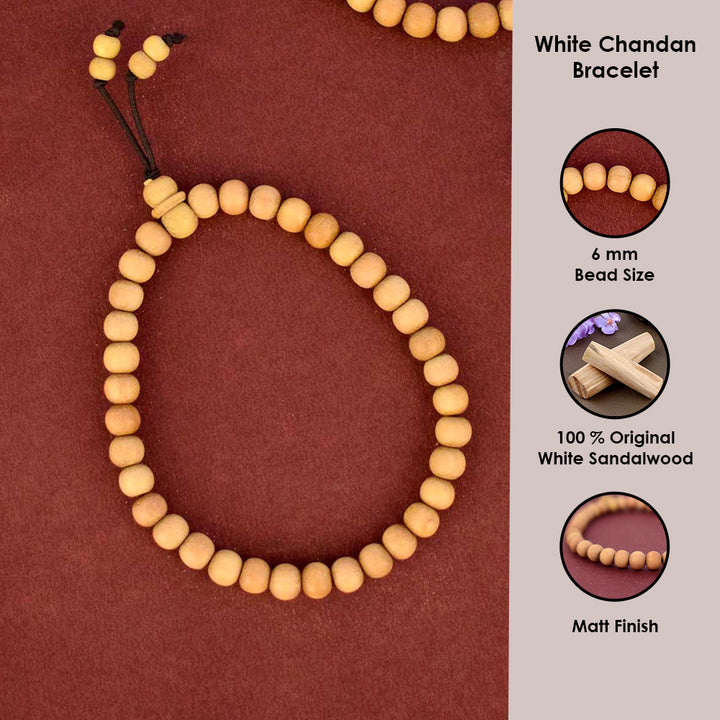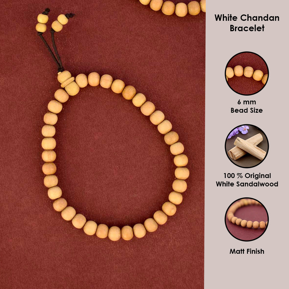 This White Chandan Bracelet is made from premium natural sandalwood beads, each measuring 6mm in size. It is delicately crafted to offer not just aesthetic elegance but also spiritual serenity and focus.