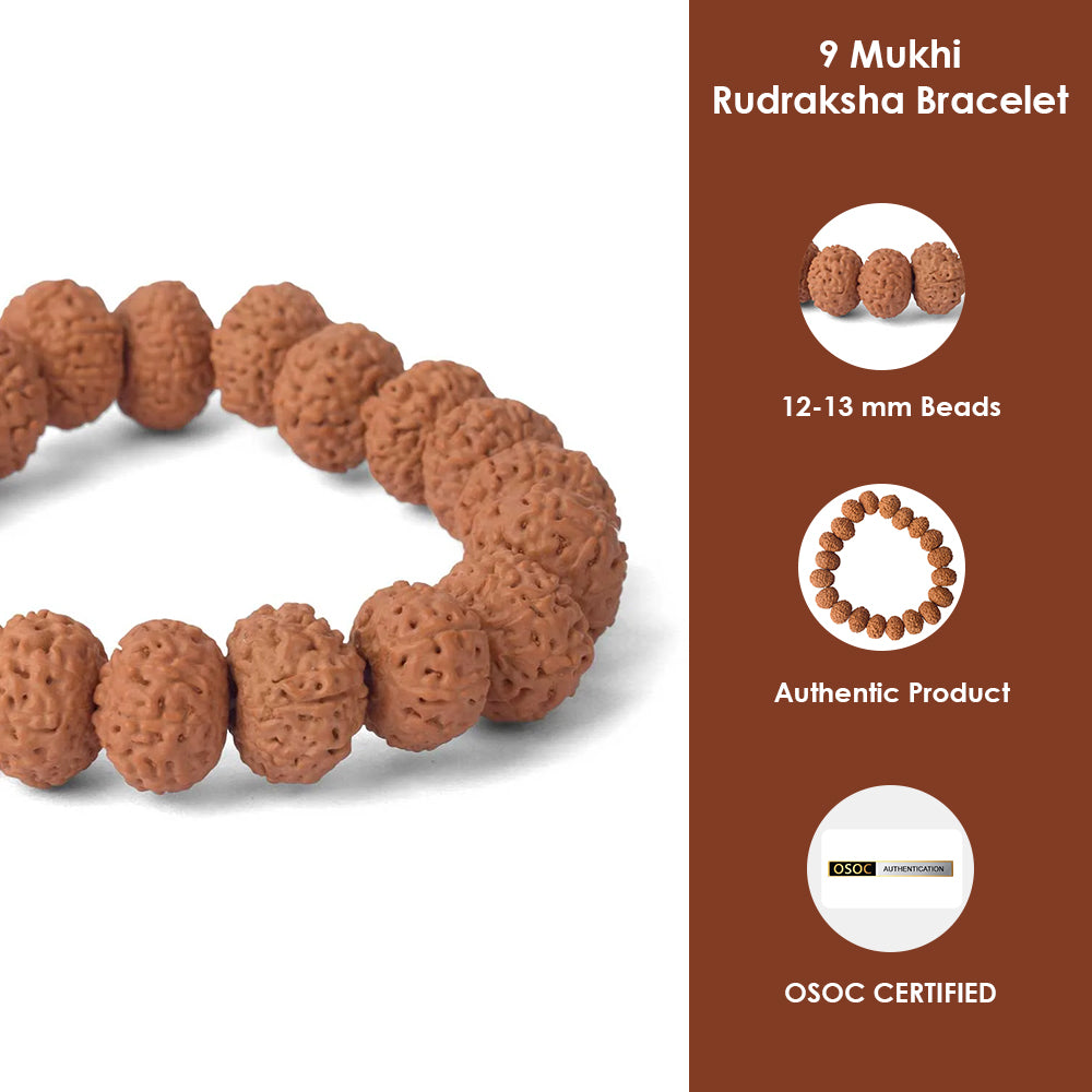 About Product The 9 Mukhi Rudraksha Bracelet represents the energy of Nav Durga, the nine forms of Goddess Durga. This sacred bead is a powerful symbol of strength, courage, protection, and divine feminine energy. It is believed to destroy negativity, remove fear, and empower the wearer with confidence and spiritual protection.
