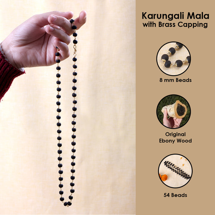 • Material: Mala beads made from tested and certified Ebony wood (Karungali) by the Central Wood Testing Laboratory, Rubber Board, Govt. of India.