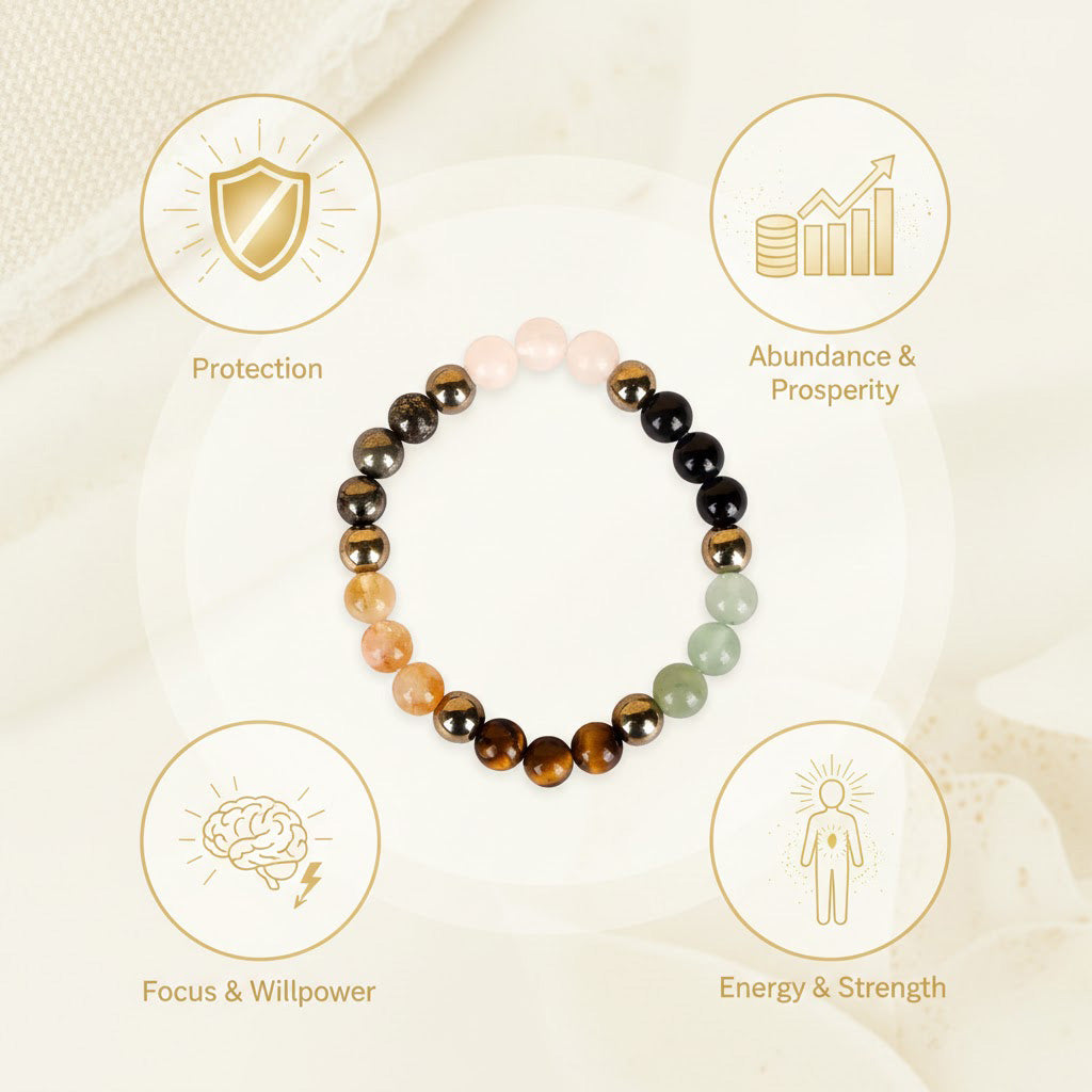The Dhan Yog Bracelet combines Citrine for manifestation, Golden Pyrite and Pyrite for wealth attraction, Green Aventurine for luck, Tiger Eye for confidence, Clear Quartz for energy amplification, and Black Obsidian for protection against negativity. Rose Quartz promotes love, peace, and emotional balance, while the Hanuman Chalisa Pendant invokes courage, devotion, and divine safeguarding. Together, this combo creates a harmonious energy flow for success, love, and spiritual well-being.