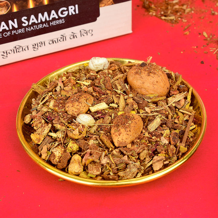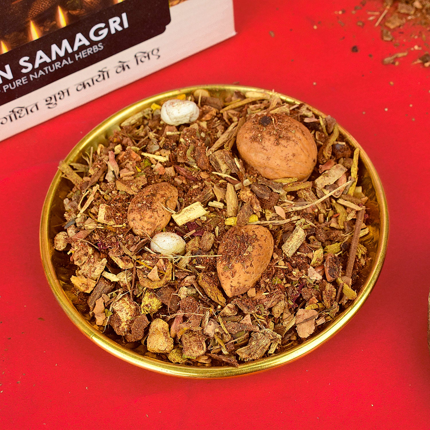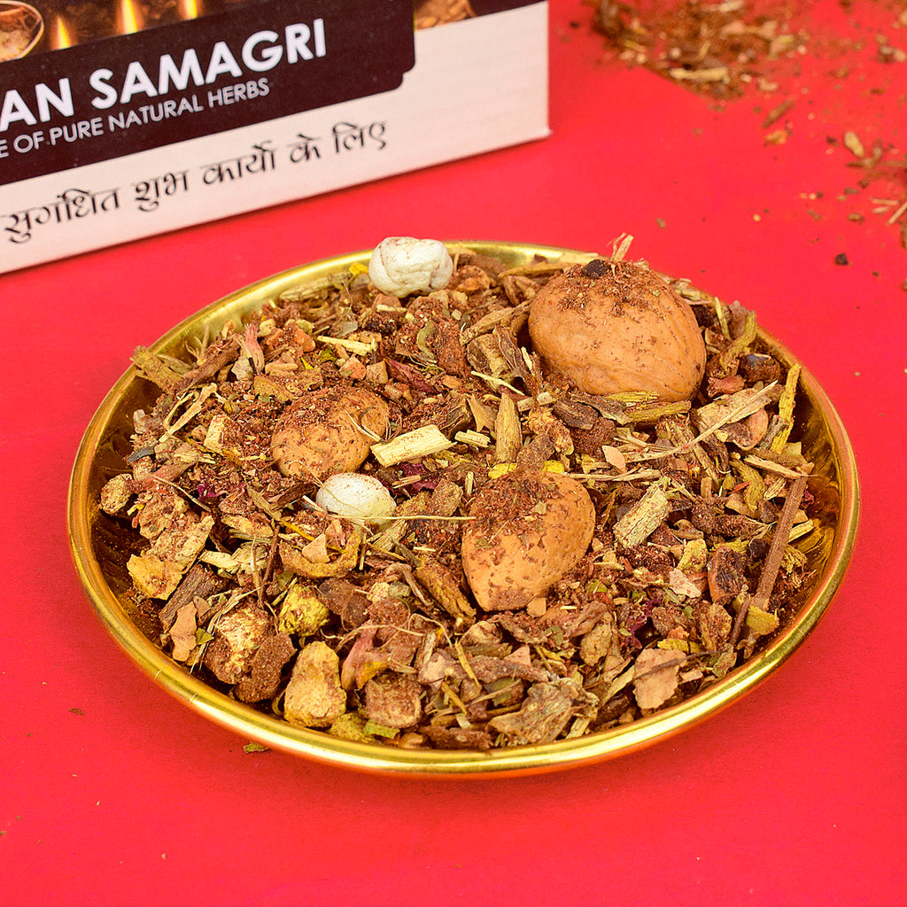• Package content: Hawan samagri content natural herbs, Phool Dhavari, Hao-Ber, Bramhi, Inder-Jo, Bhimseni Kapoor, Rose Petals, Sandalwood Powder, Loban, Nagakesara, Red Sandal Powder, Nagarmotha, Lotus Seeds, Jatamansi, Kapoor Kachri, Shatavari, and Narkachoor.