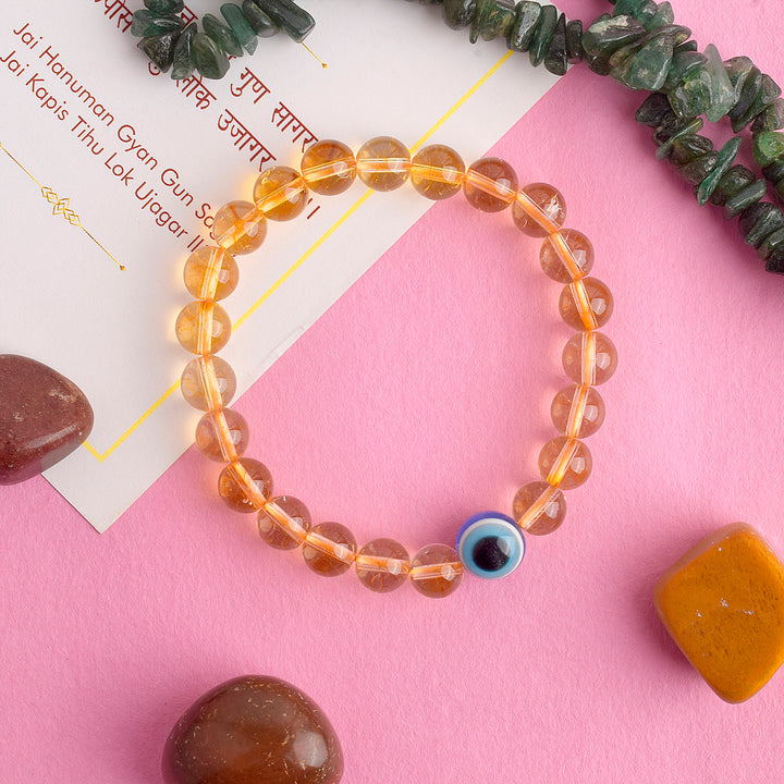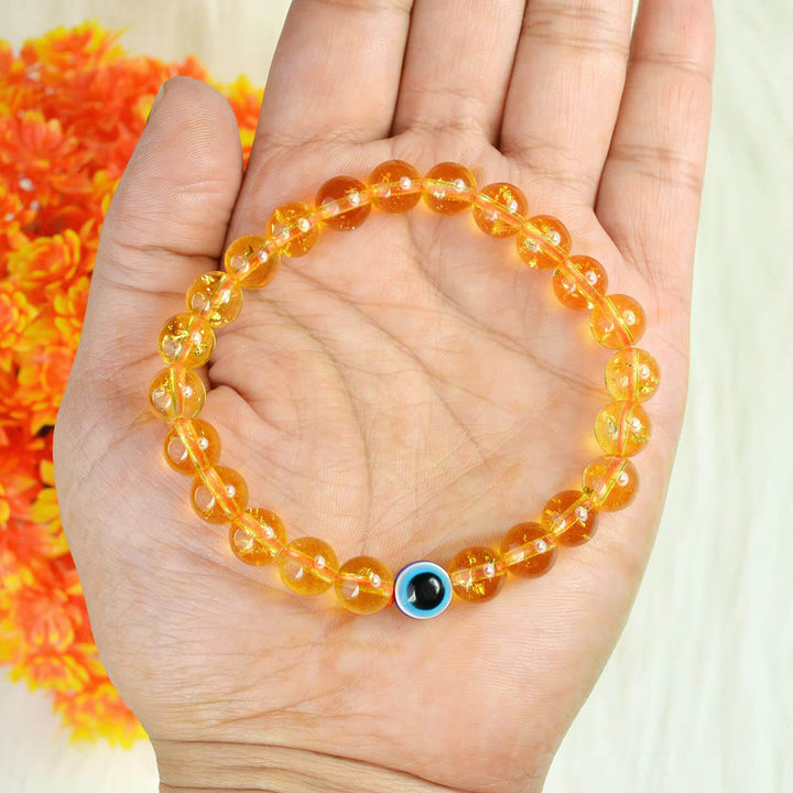About Product: The Authentic Citrine with Evil Eye Bracelet beautifully combines the natural power of Citrine with the protective energy of the Evil Eye charm. Known as the β€œMerchant’s Stone,” Citrine is believed to attract wealth, success, and positive energy, while the Evil Eye safeguards you from negativity and unwanted energies.