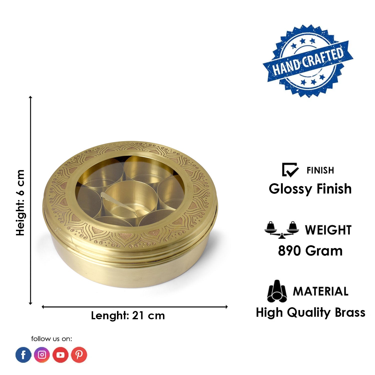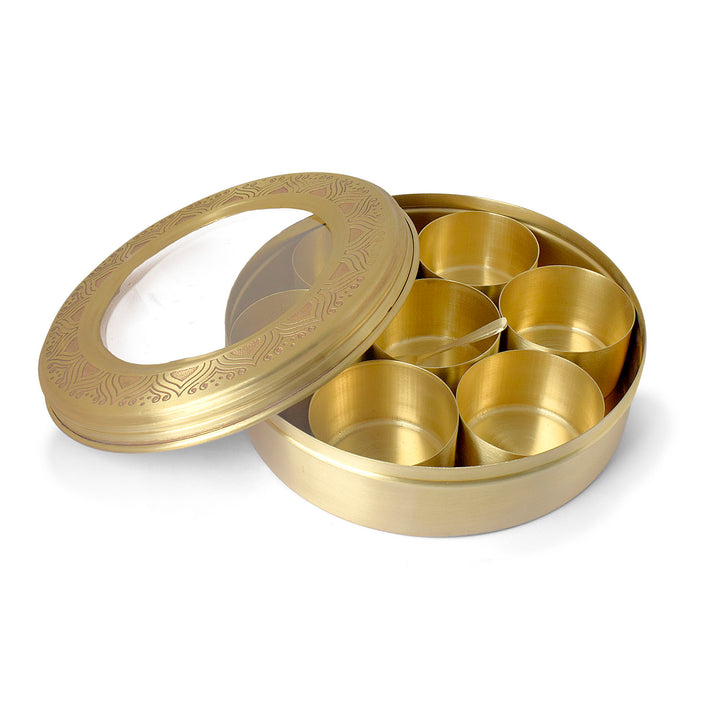 Elevate your Pooja room with this exquisite spice storage container featuring 7 compartments, crafted in pure brass. The traditional Indian Brass smithing techniques, coupled with intricate etching, add a touch of elegance. Each Brass box is handcrafted, ensuring a unique and distinct character with minor variations, making it a truly special addition to your sacred space. Upgrade your Pooja Ghar with this artisanal brass piece, blending functionality with timeless design.