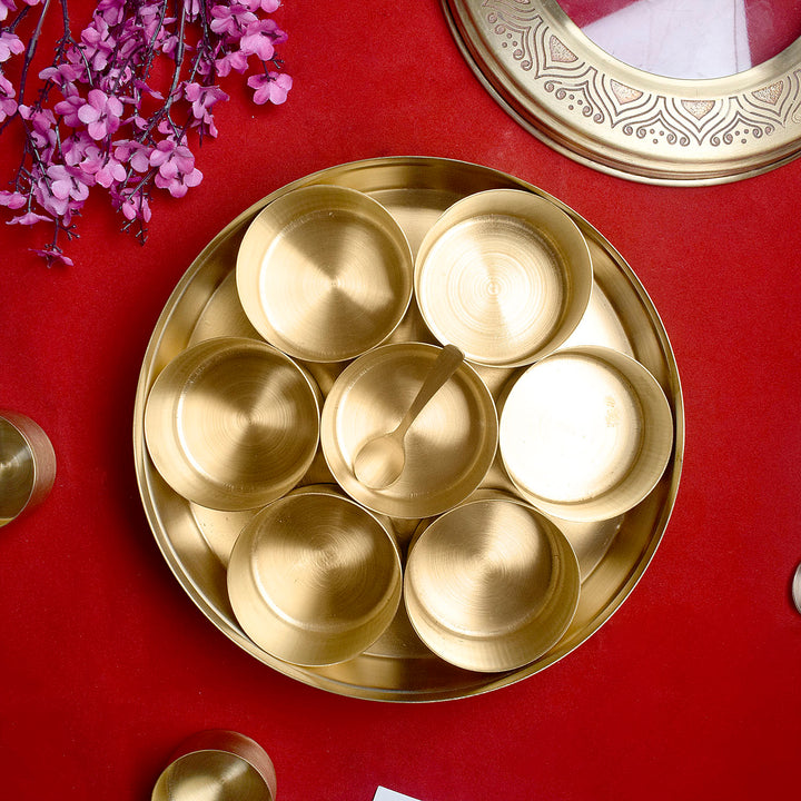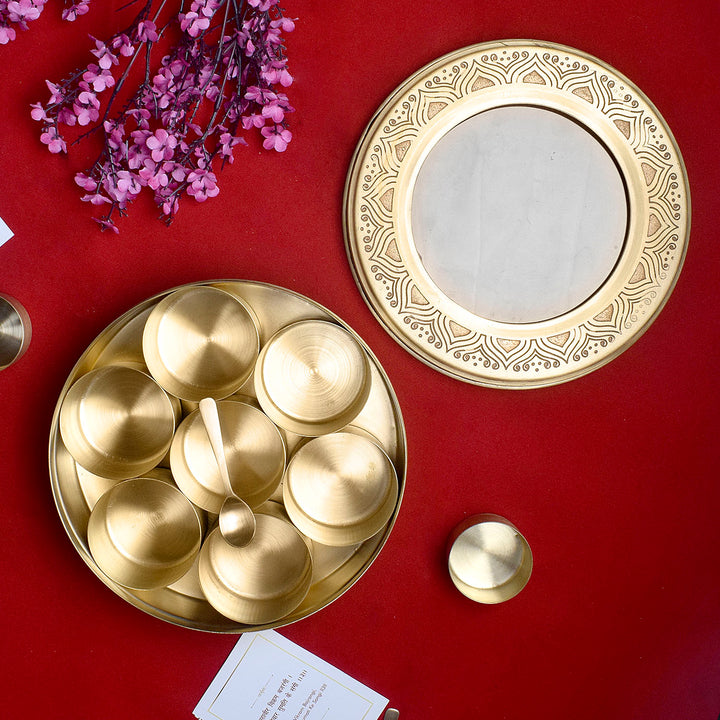 Premium Brass Pooja Samagridaan Set - 7 Containers with Spoon and Glass Lid