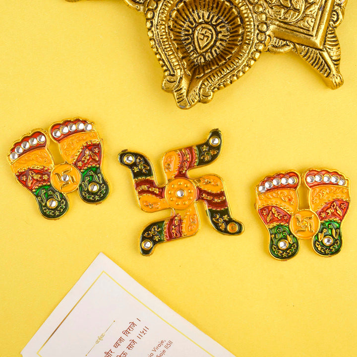 Shubh Labh Leaf With Swastik Wooden StickerPackage Contains: 1 Pair of Charan Paduka and 1 Swastik Sticker