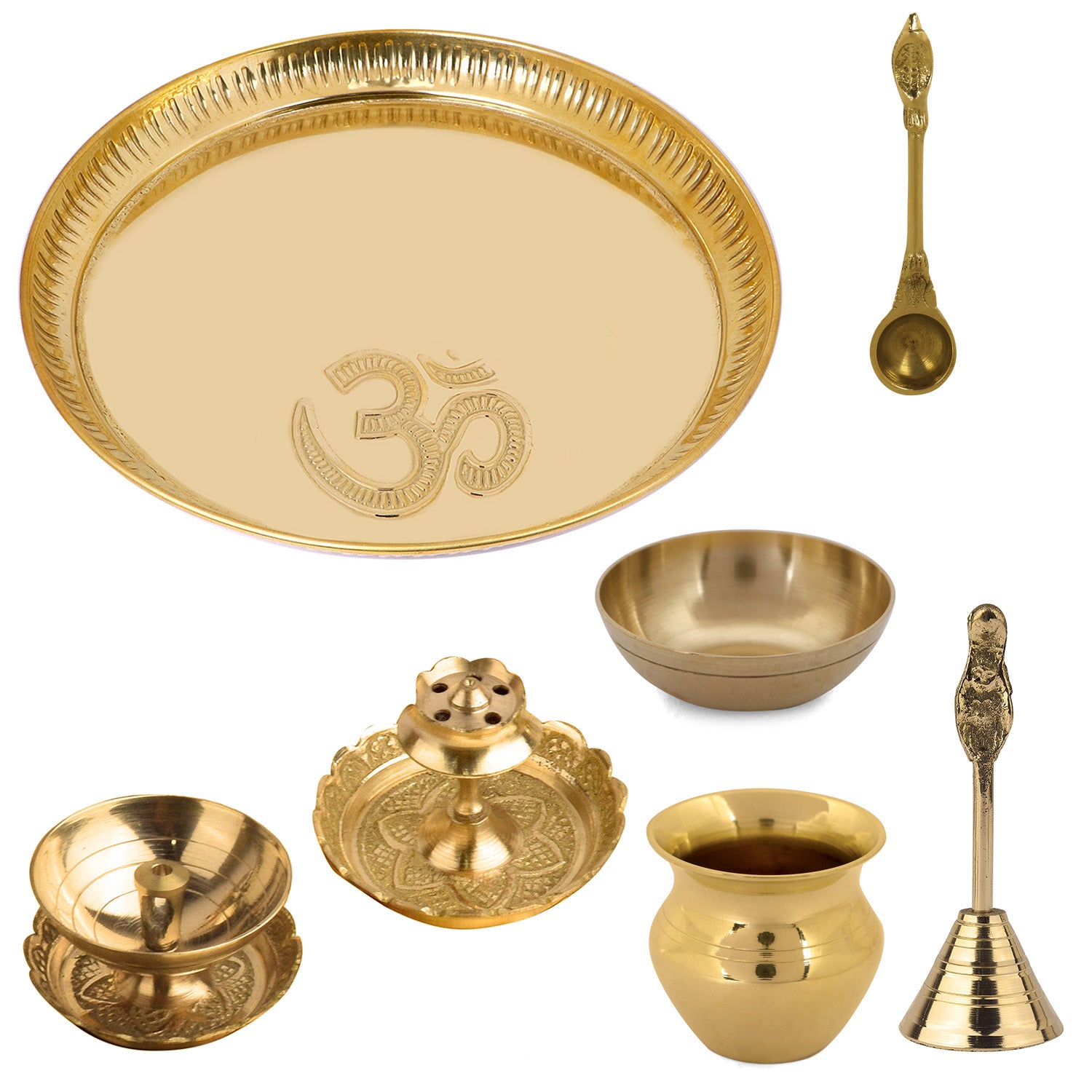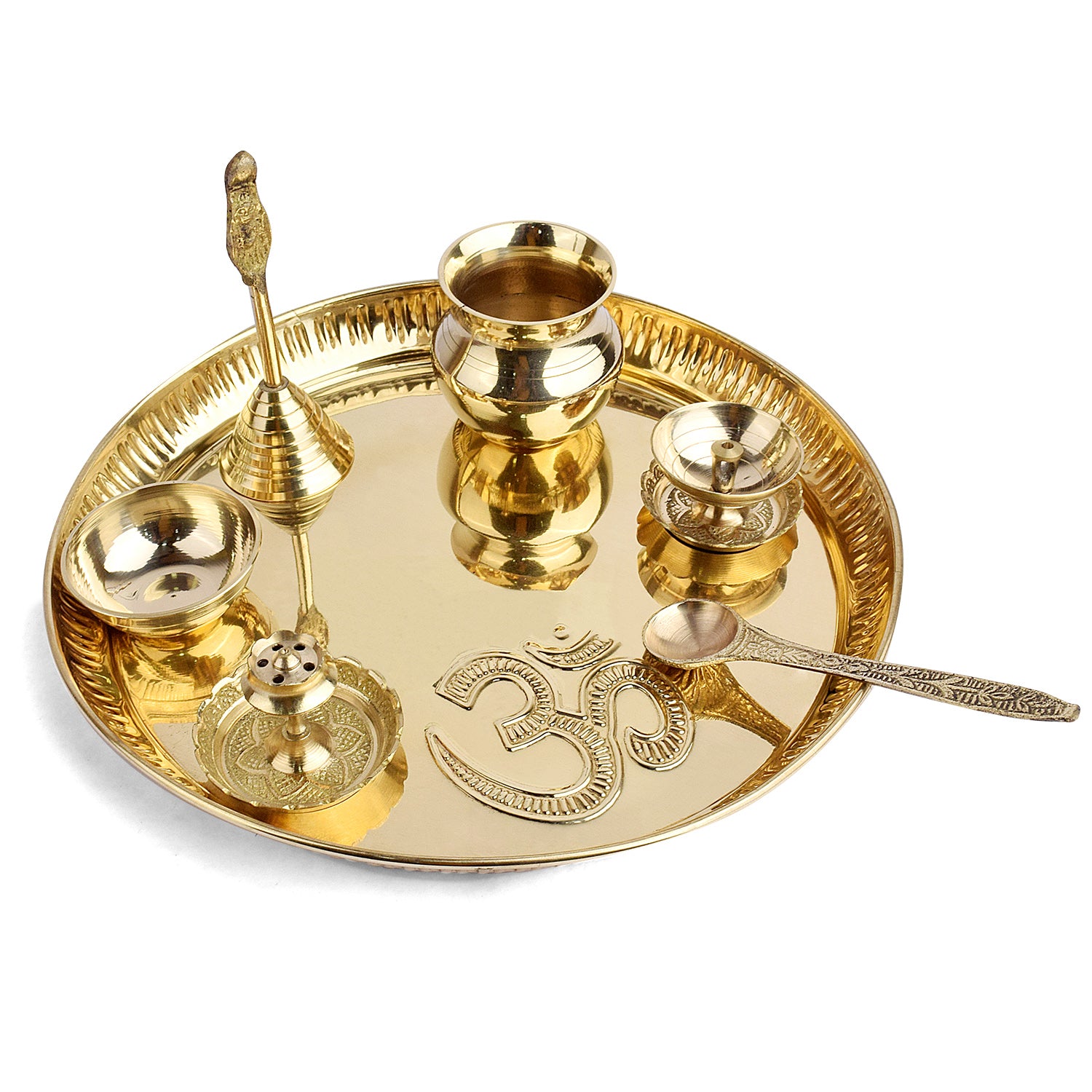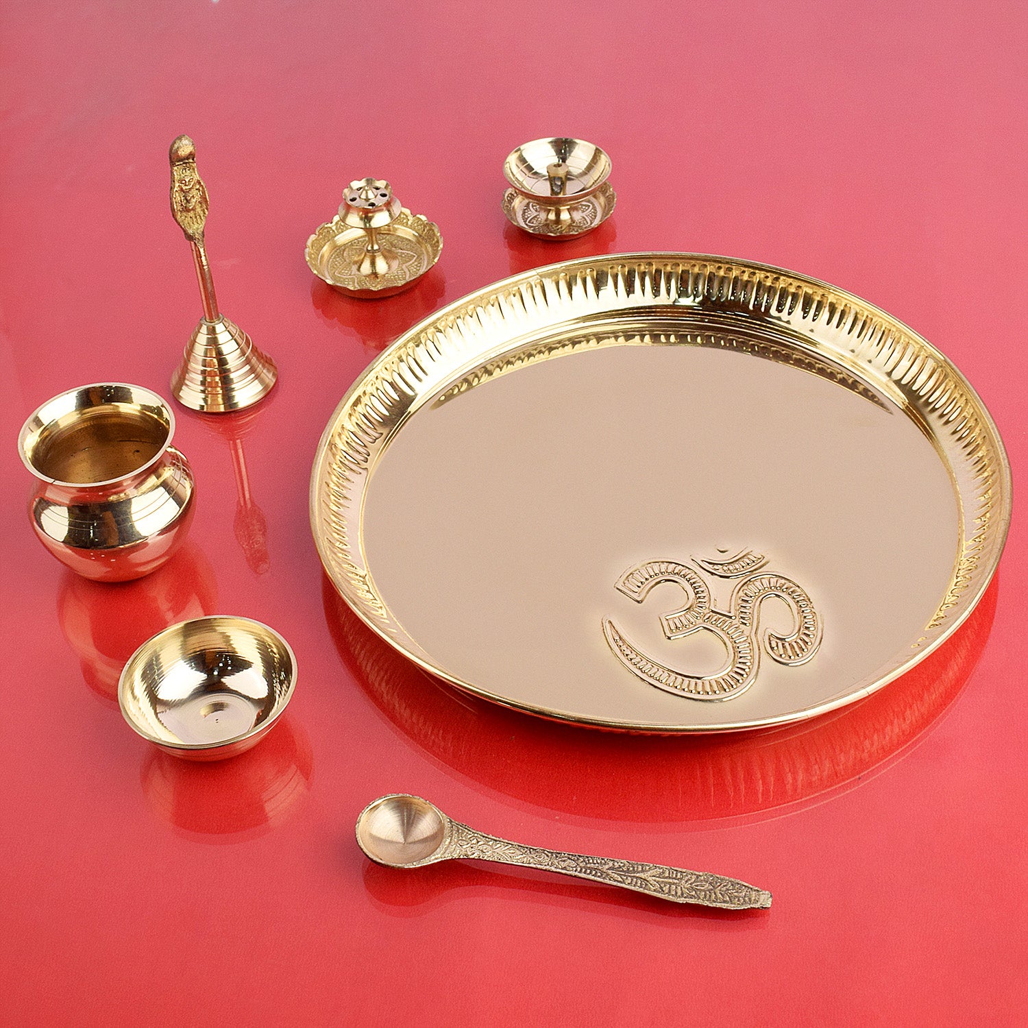 Shop Online 7 Piece Brass OM Pooja Thali Set (9 Inch) | Satvikstore.in – satvikstore.in
