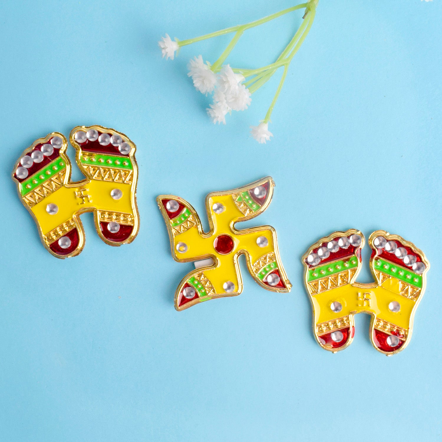 Item Name: Diwali Bliss Yelllow charan Paduka and Swastik Stickers s Set of 3