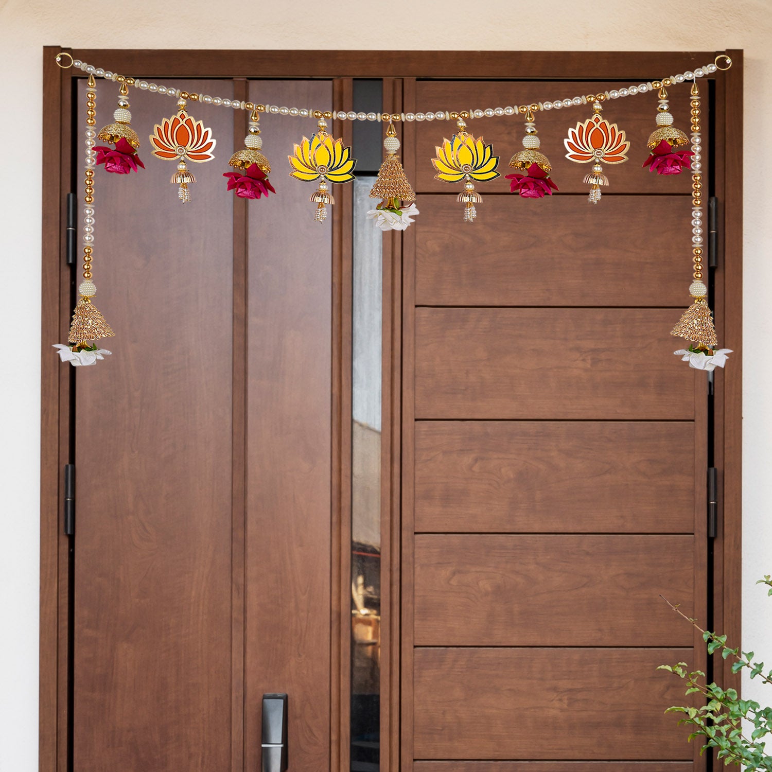 lotus toran for door | elegant door hanging | artificial flower toran | festive Indian decoration | diwali lotus toran | navratri entrance décor | pooja room toran | acrylic lotus with beads | traditional toran with side latkans | handmade Indian door décor