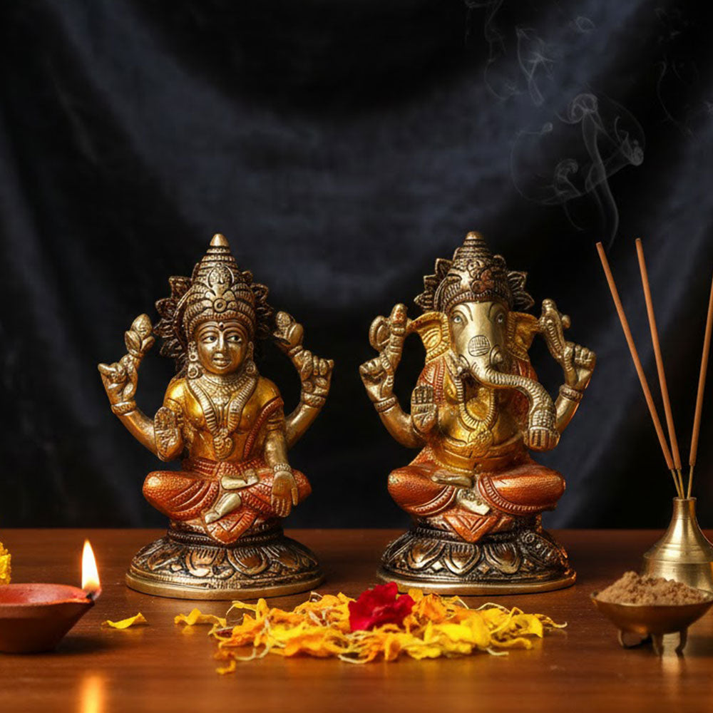 Crafted from high-quality pure brass, this idol pair features fine detailing and a traditional finish, making it ideal for home temple, office desk, shop, or vastu placement. Worshipping Laxmi-Ganesha together is especially recommended during Diwali, business openings, housewarming ceremonies, and new ventures to attract continuous prosperity and positive energy.This brass idol pair is not just a decorative piece but a powerful spiritual symbol that brings harmony, financial stability, and divine blessings into your space.