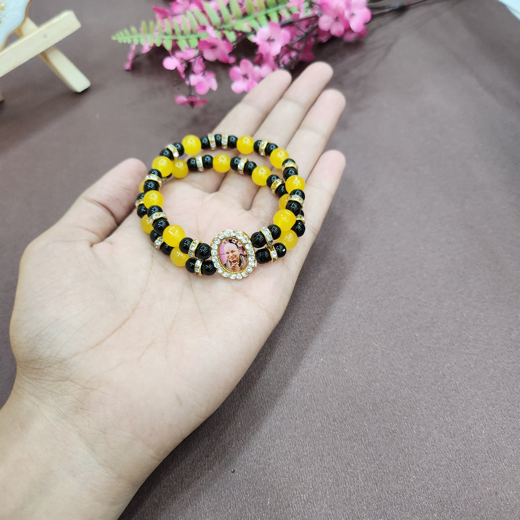 • Item Name:  Black And Yellow Round Pearl Bracelet with Jai Guruji Swaroop Handmade Bracelets for Men and Women.
