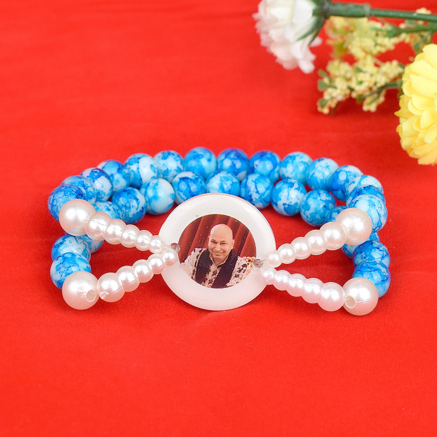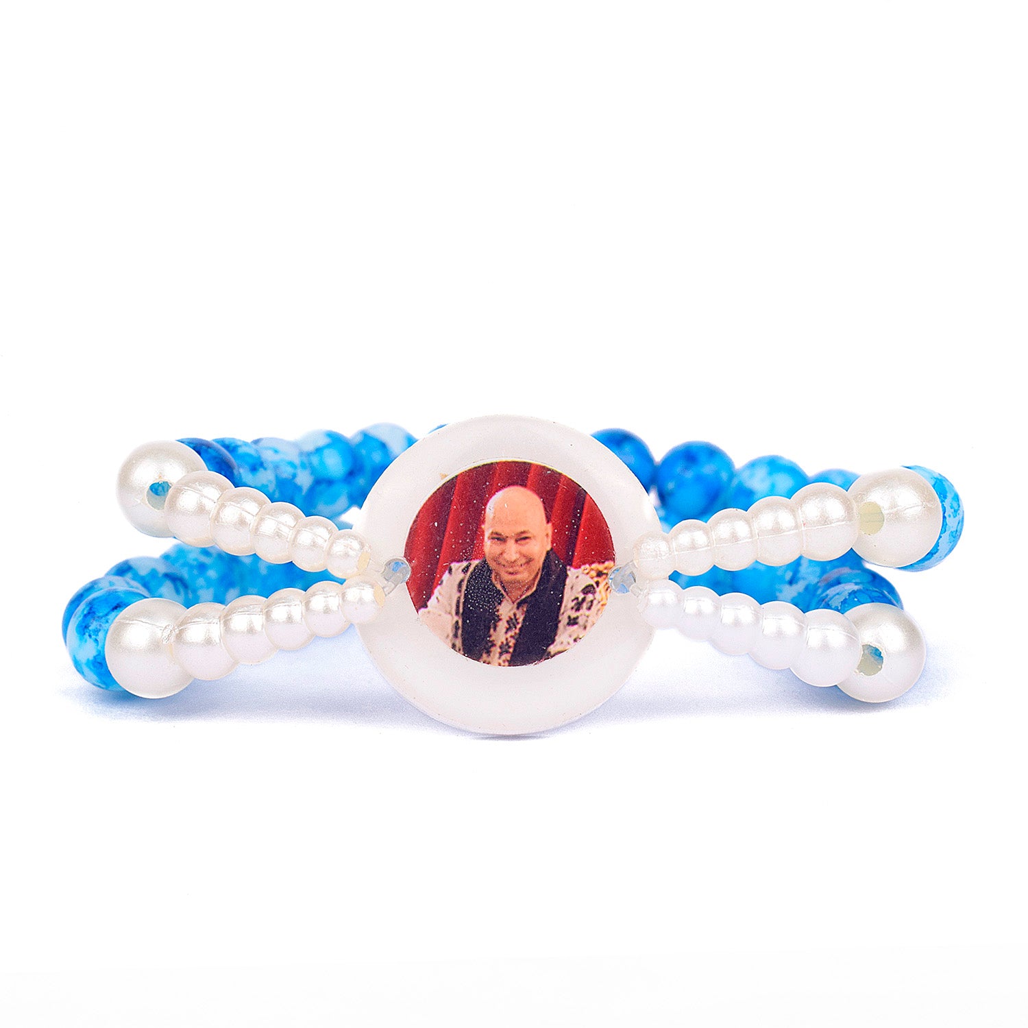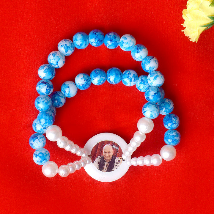 Crystal Blue Beads Double Layer & White Pearl Bracelet with Jai Guruji Swaroop