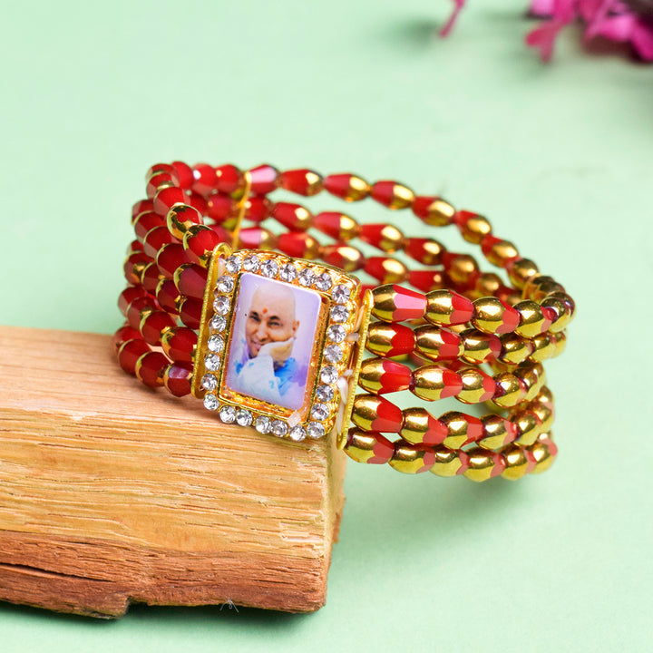 Jai Guruji Swaroop Pearl Bracelet adorned with Crystal Red Beads