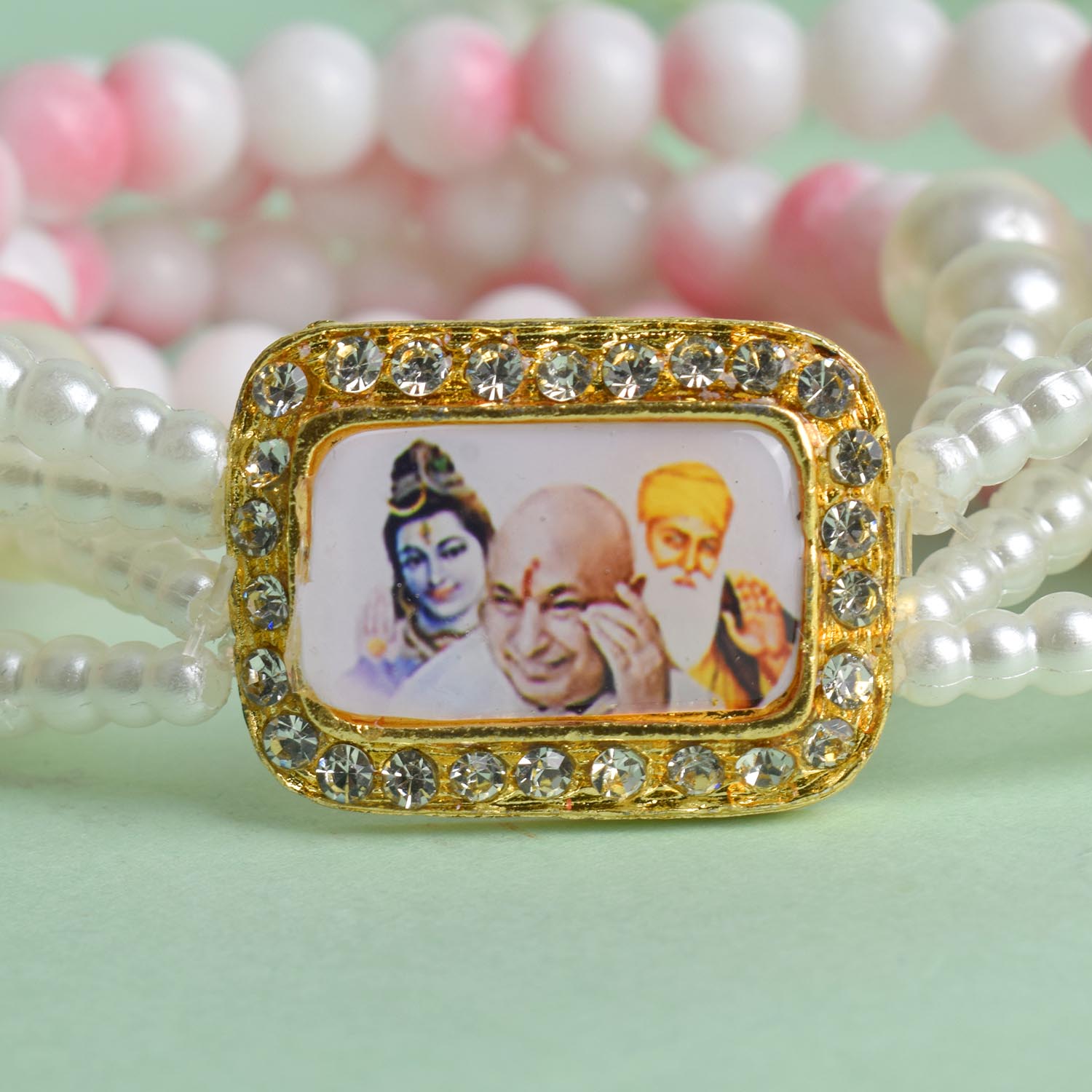 white guruji bracelet | pink marble guruji bracelet | white pink bracelet | white pearl guruji bracelet | four layer spiritual bracelet | elegant guruji swaroop bracelet | divine pink beads bracelet | marble effect bracelet with pearls | jai guruji bracelet | spiritual jewellery india | soft pink spiritual bracelet | pooja return gift for women | stylish spiritual bracelet | meditation accessories | guruji bracelet india | marble pearl bracelet | satvikstore bracelet | guruji bracelet online india | pooja items