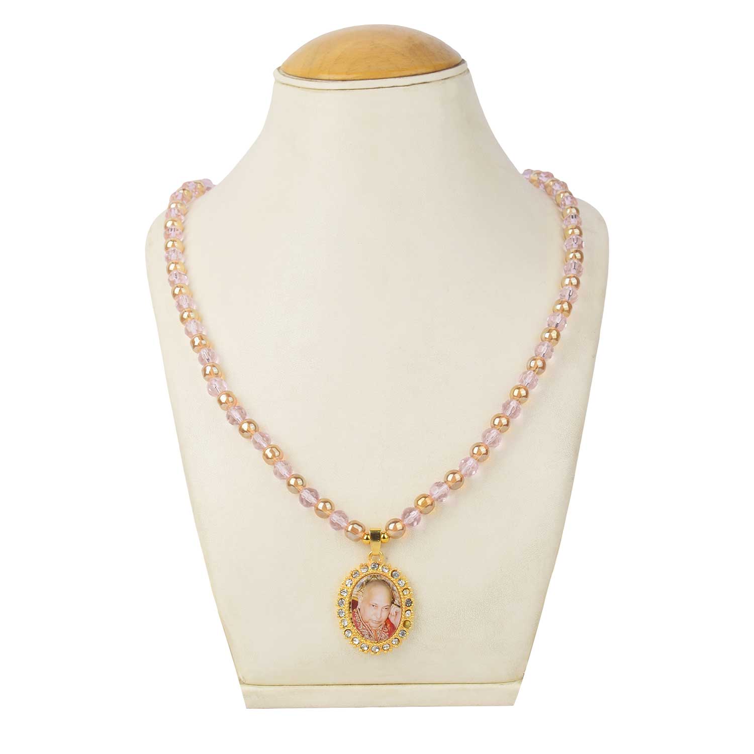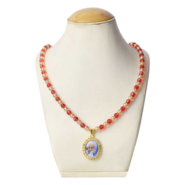 The Guruji neck mala is a sacred adornment that carries the energy of Guruji's blessings. Handmade with devotion, this mala comprises prayer beads and a Guruji pendant. When worn, it fosters a sense of inner peace and spiritual harmony, aiding in meditation and connecting you to Guruji's teachings.