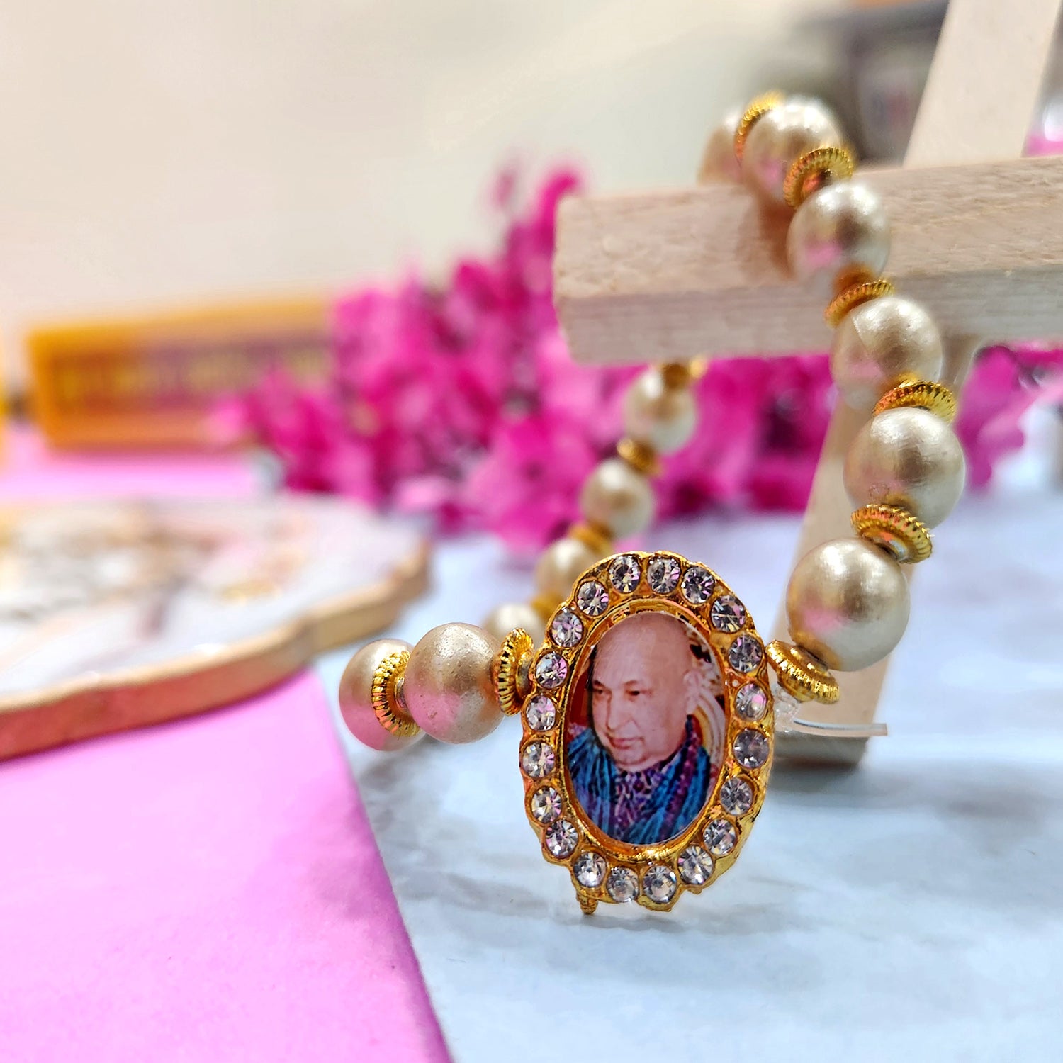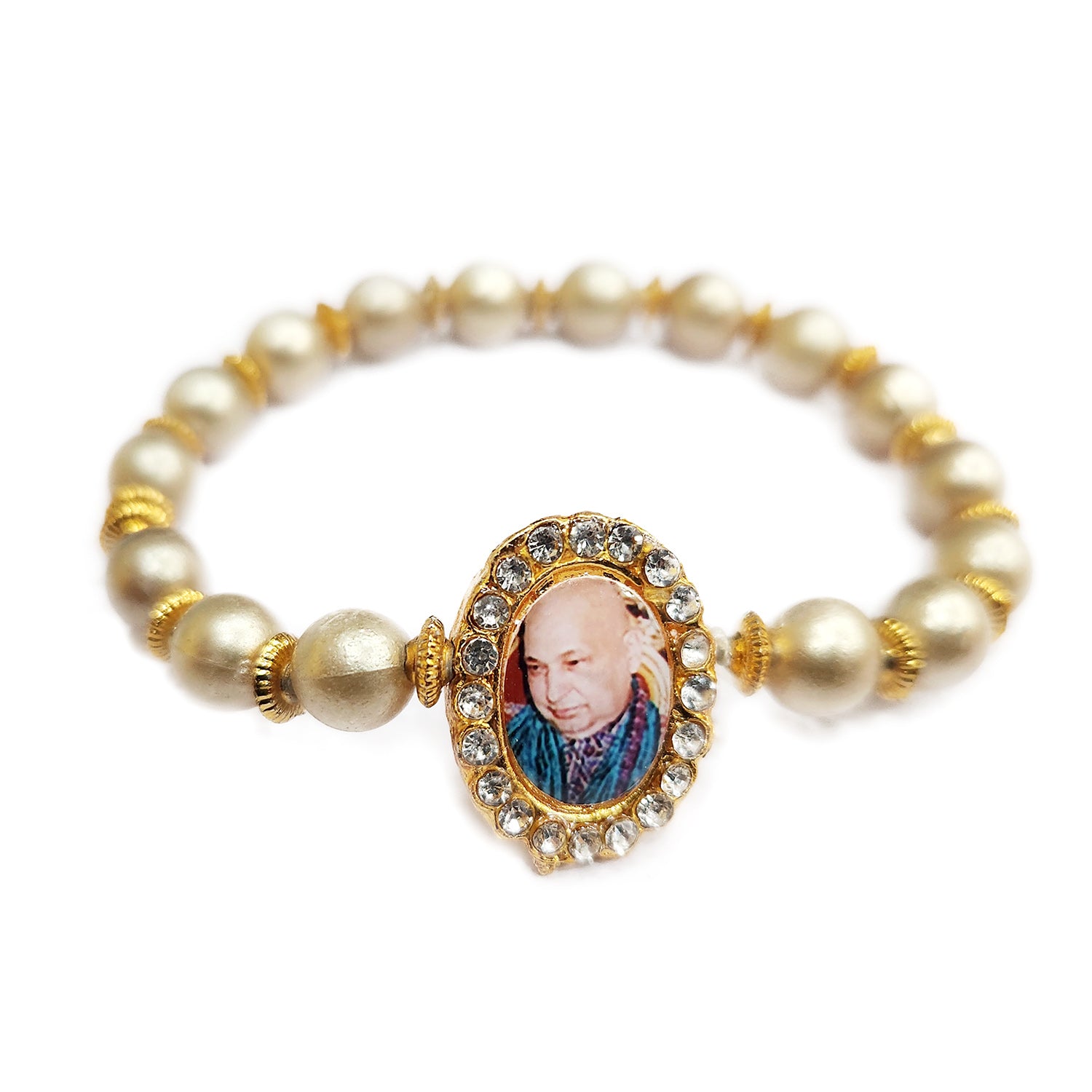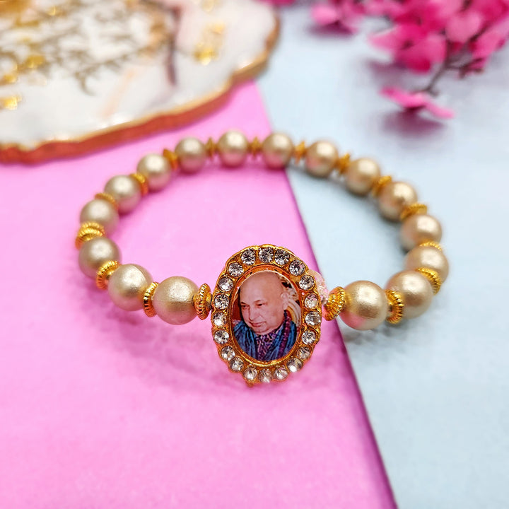 Our Guruji bracelet is a tangible symbol of divine connection. Crafted with care and reverence, it is designed to be worn close to your heart, serving as a constant reminder of Guruji's presence. The bracelet is adorned with sacred symbols and gemstones that hold spiritual significance, channeling positive energy and protection.