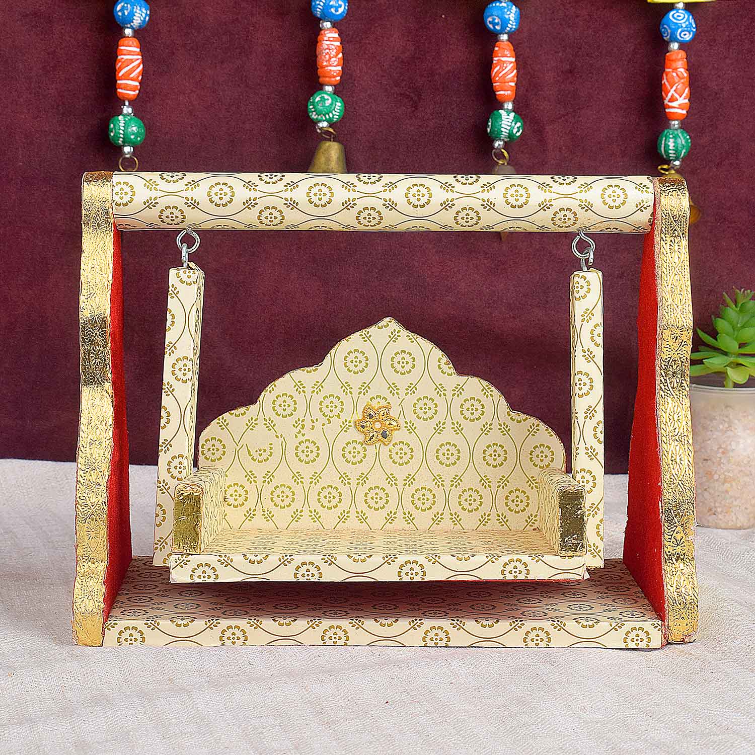 Printed Design Jhula – White & Gold Wooden Swing for Laddu Gopal