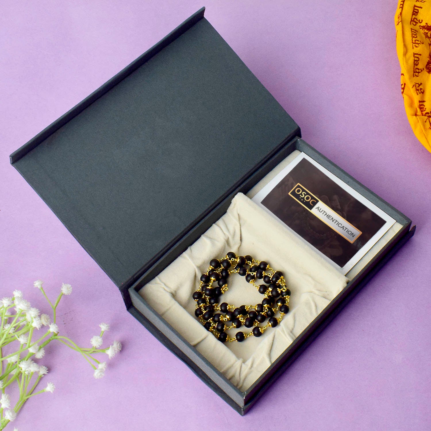 • Material: Mala beads made from tested and certified Ebony wood (Karungali) by the Central Wood Testing Laboratory, Rubber Board, Govt. of India.