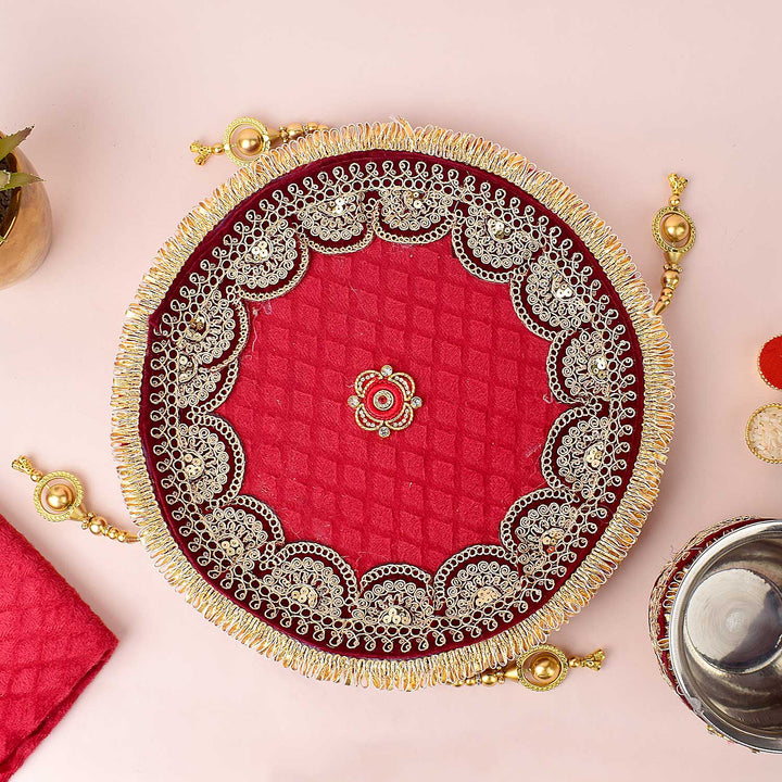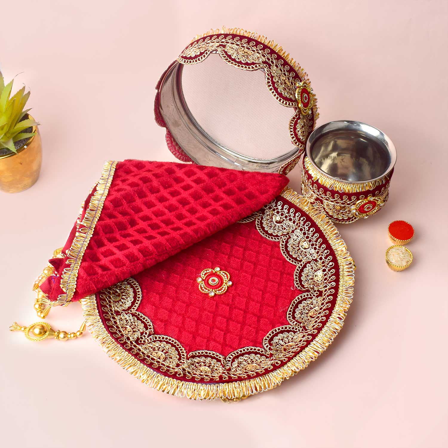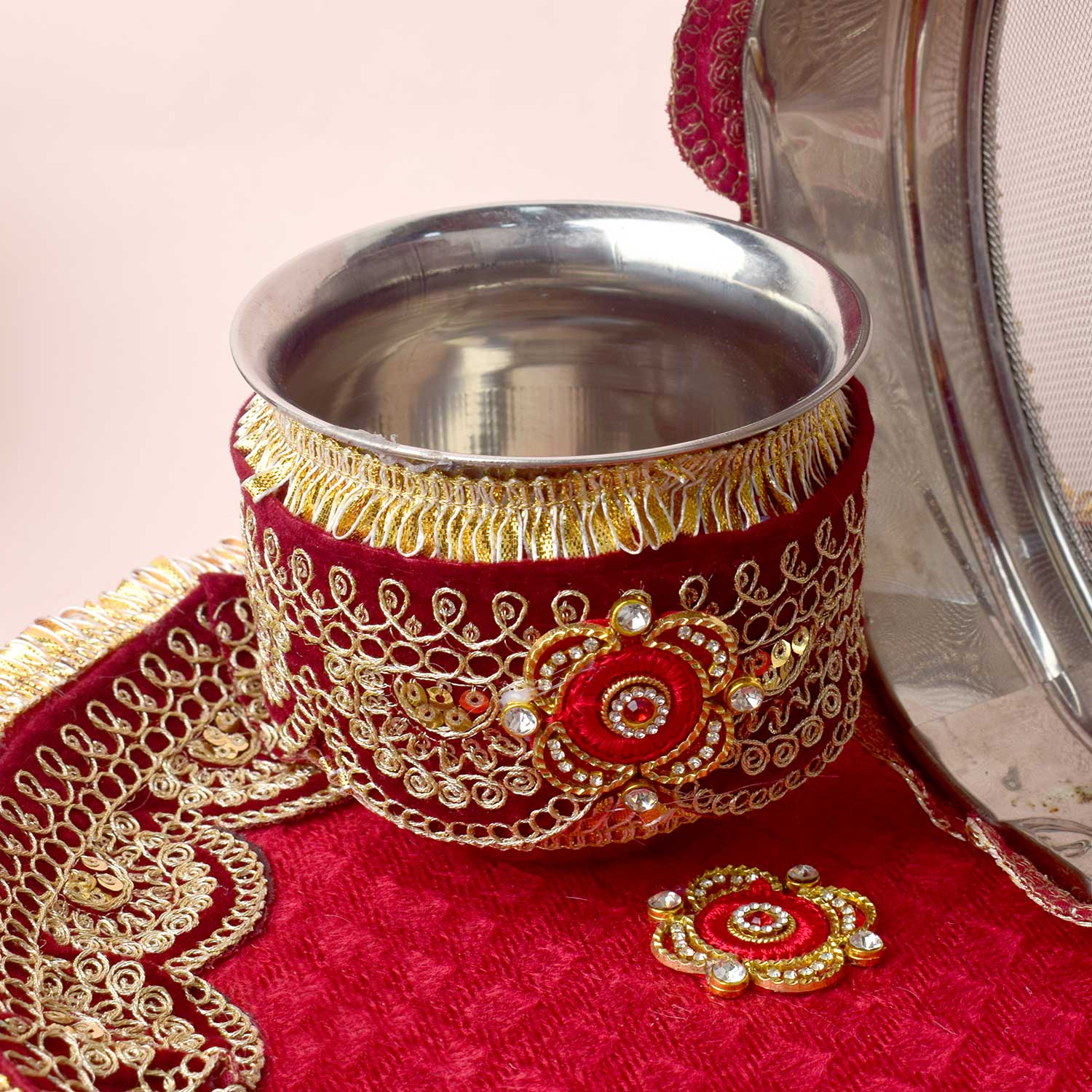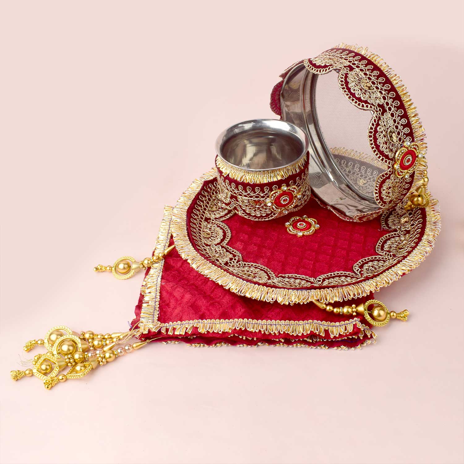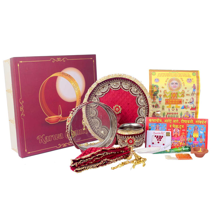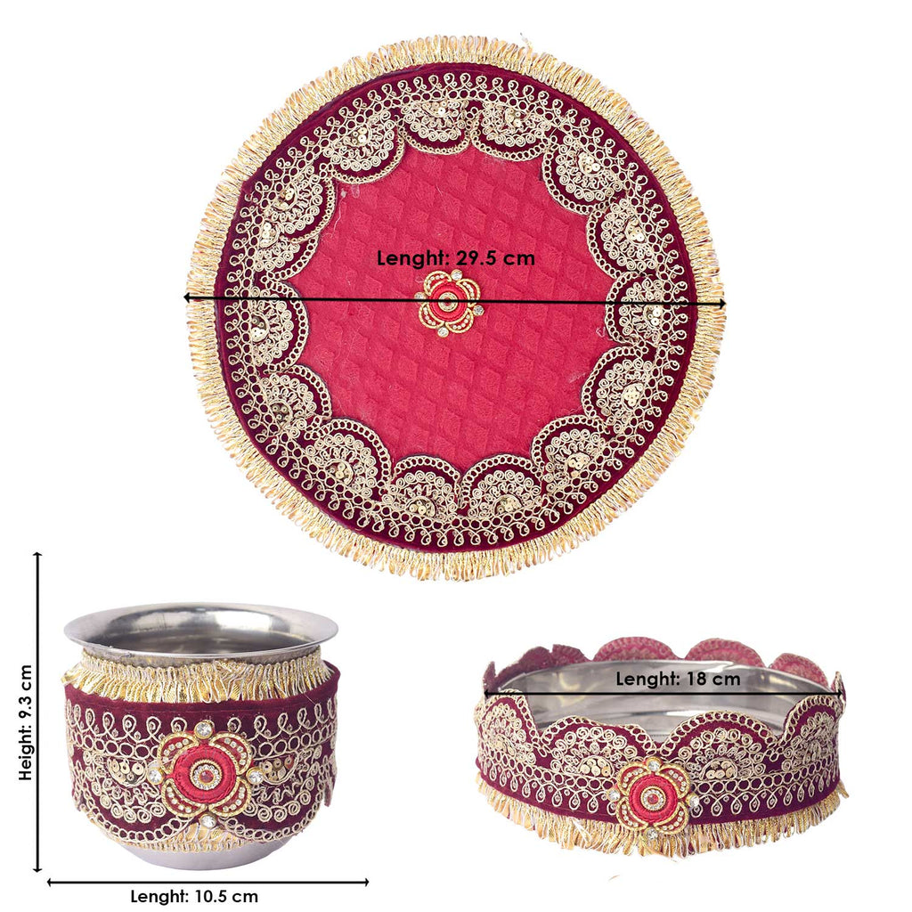Buy Maroon Embroidery Karwa Chauth Thali Set 11 Pc | Satvikstore.in – satvikstore.in