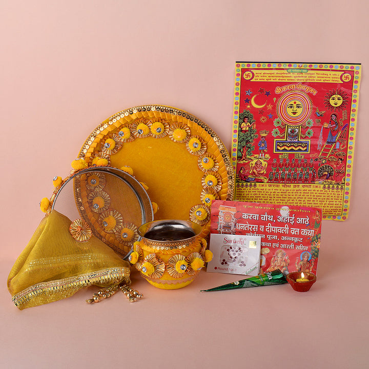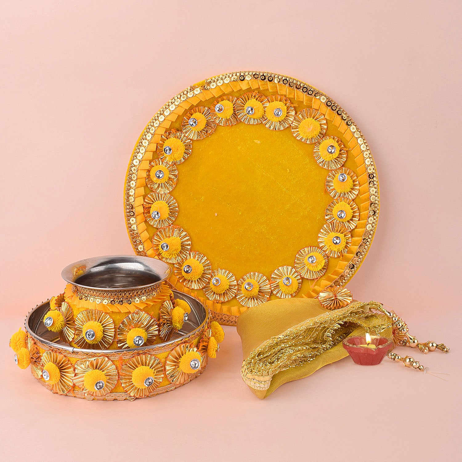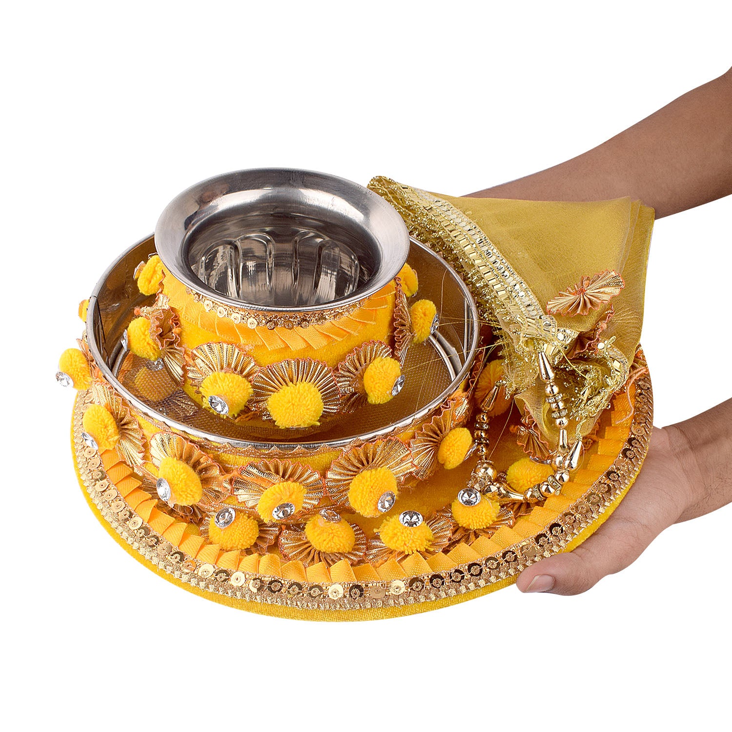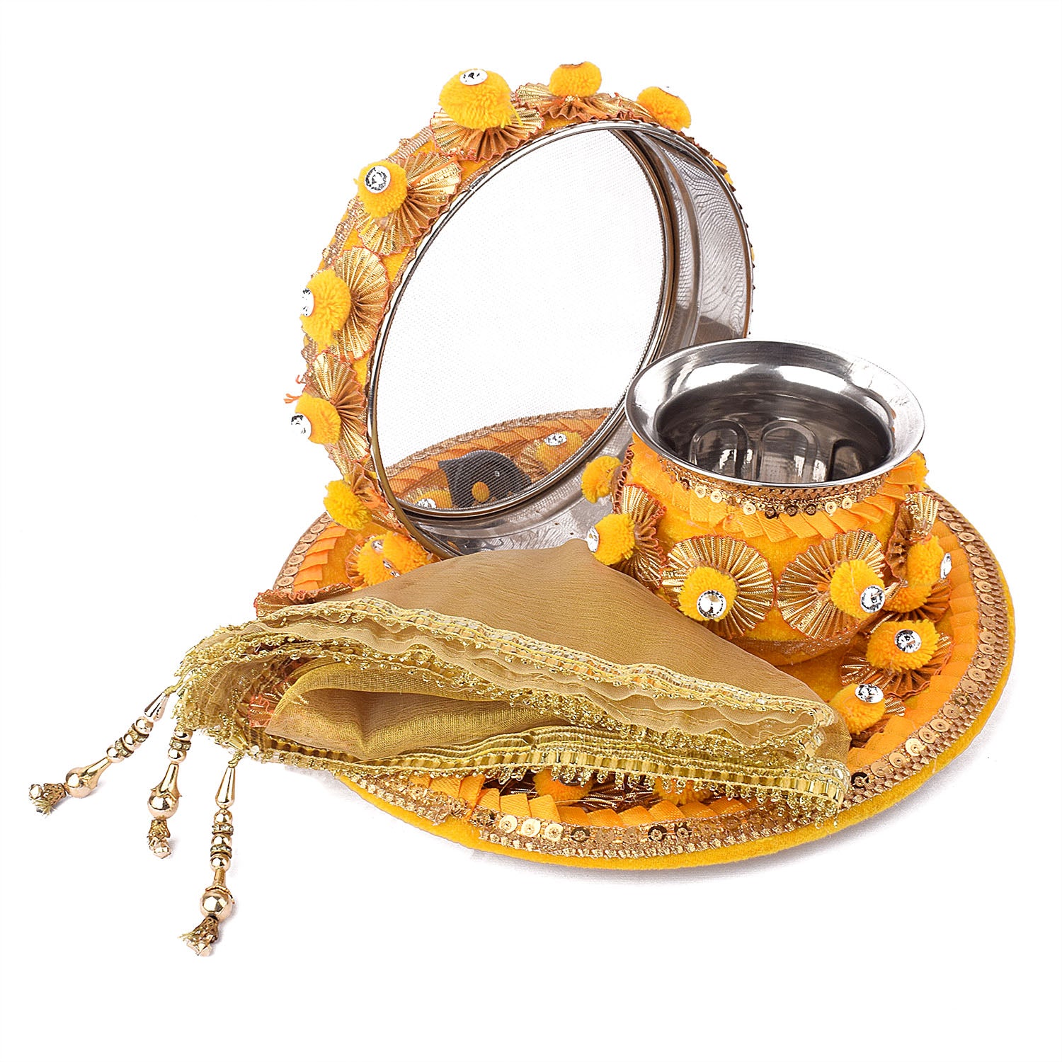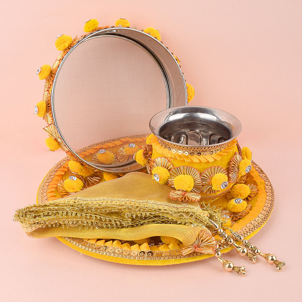 11 Pc Yellow Pompom Karwa Chauth Karva Chauth Thali Set with Cover – satvikstore.in