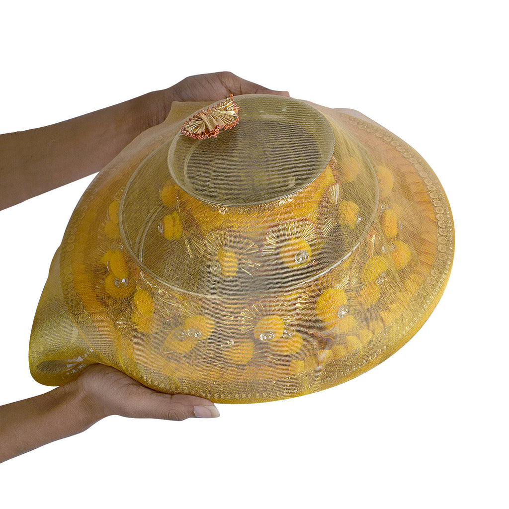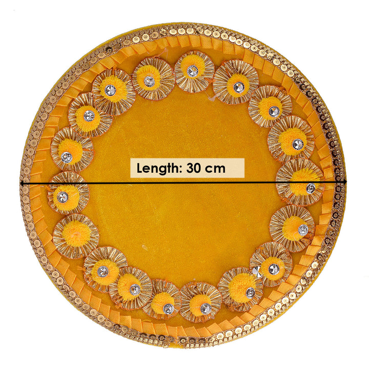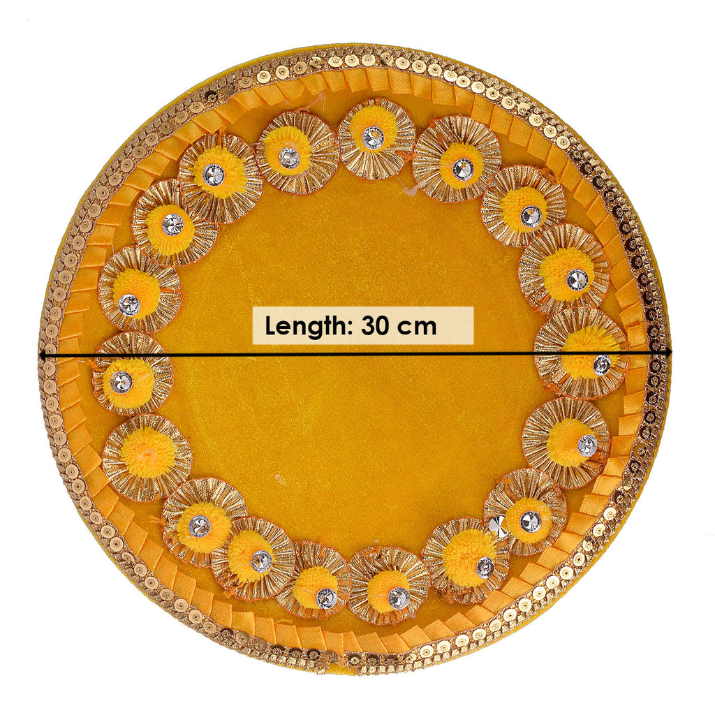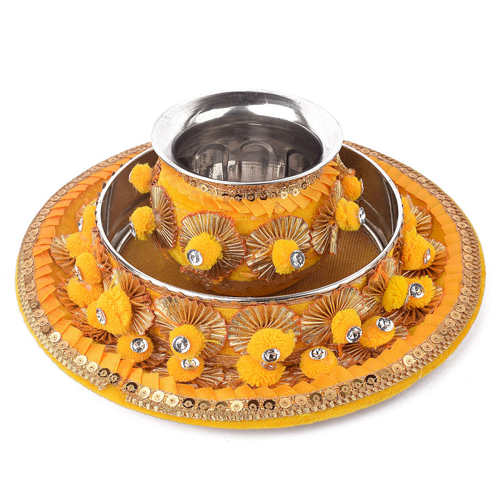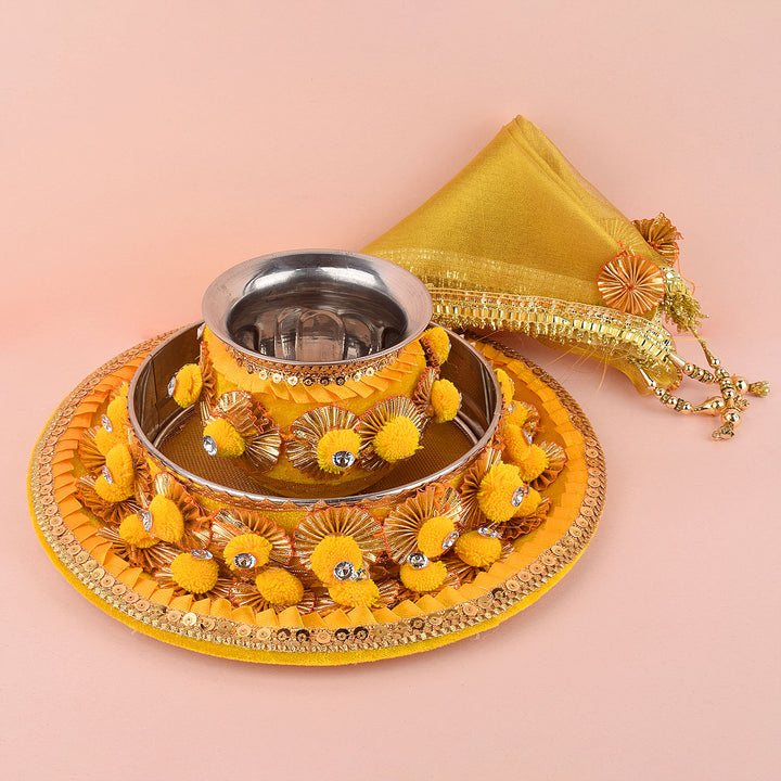 Item Name: 11 Pc Yellow Pompom Karwa Chauth Thali Set with Cover