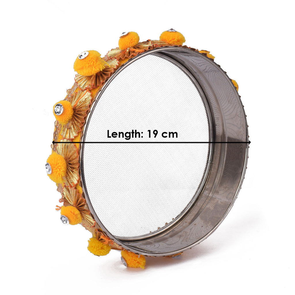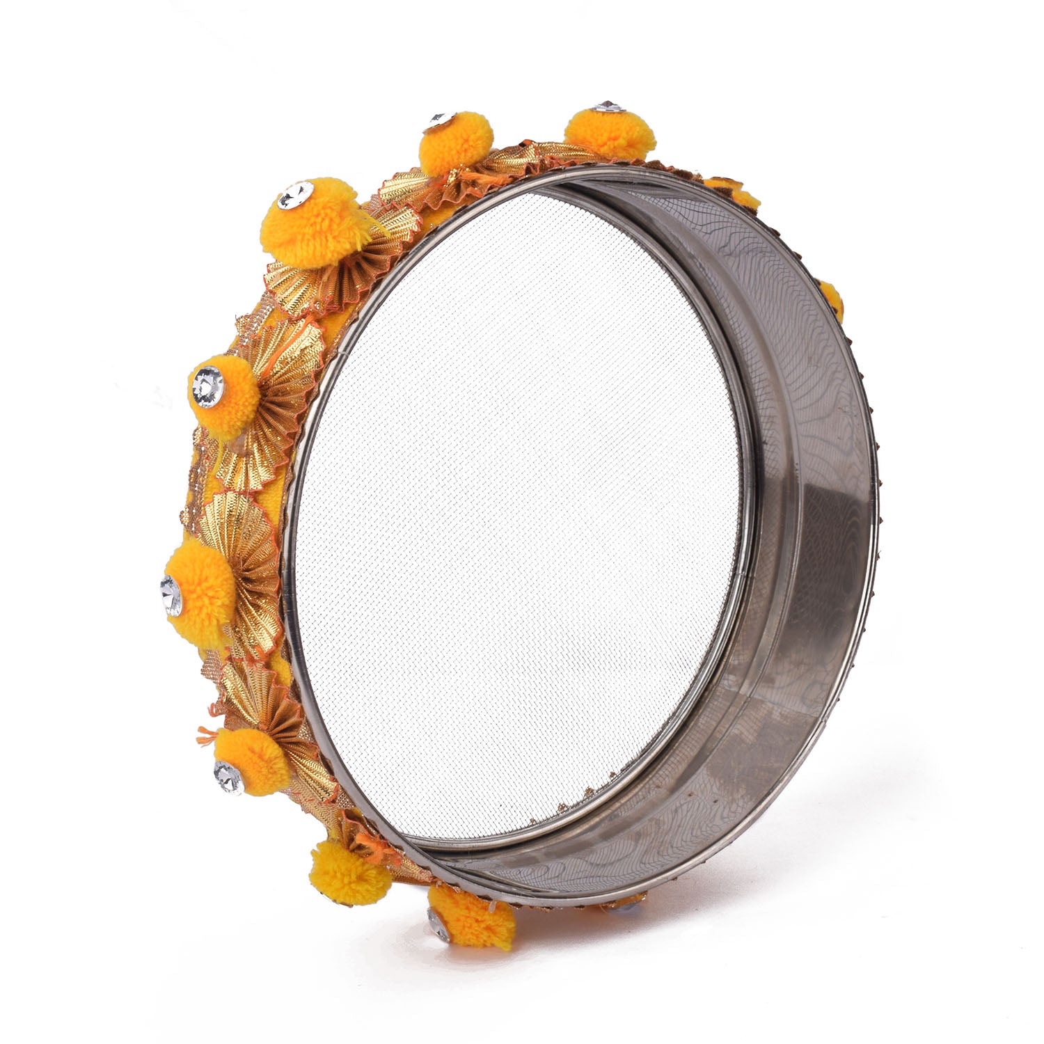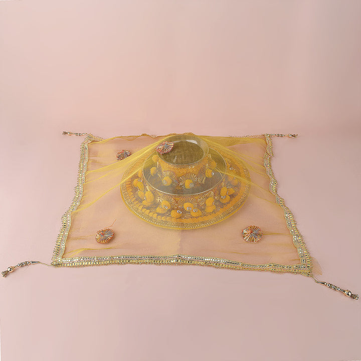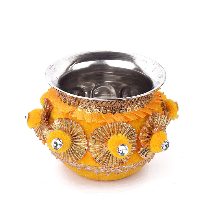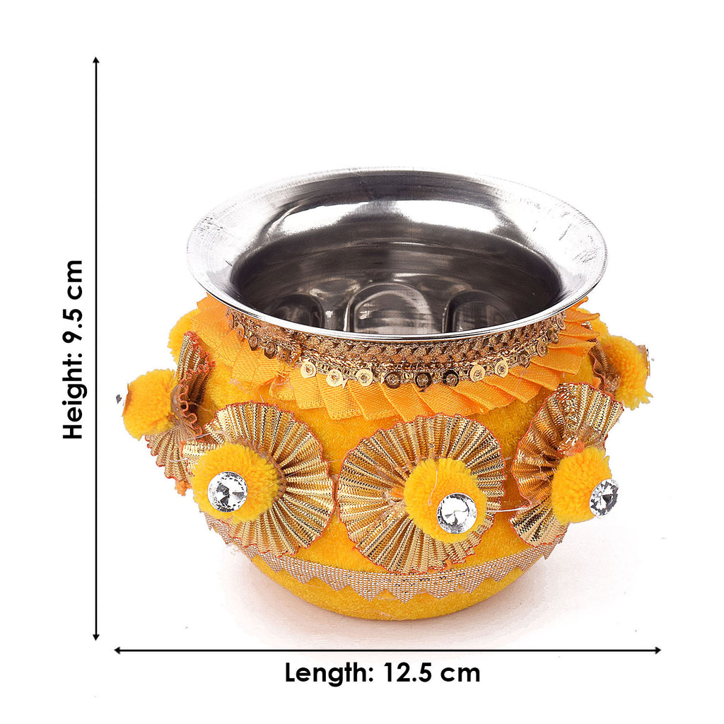 Item Name: 11 Pc Yellow Pompom Karwa Chauth Thali Set with Cover