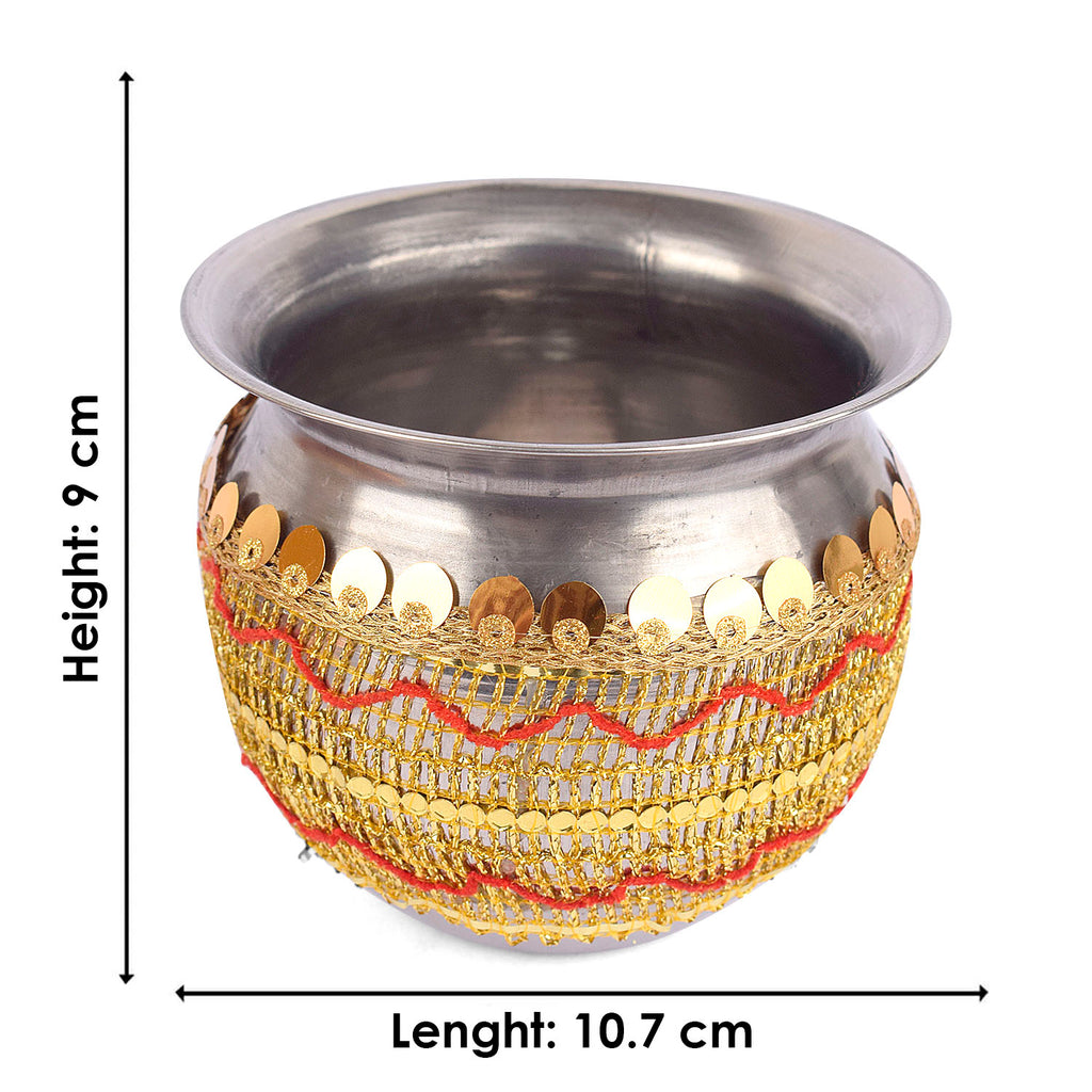 Design: Beautiful Handcrafted Designer Karwa Thali with Fabric all over the Thali and Lace Work all over the Lota and Sieve (Channi), Which makes it more Attractive.