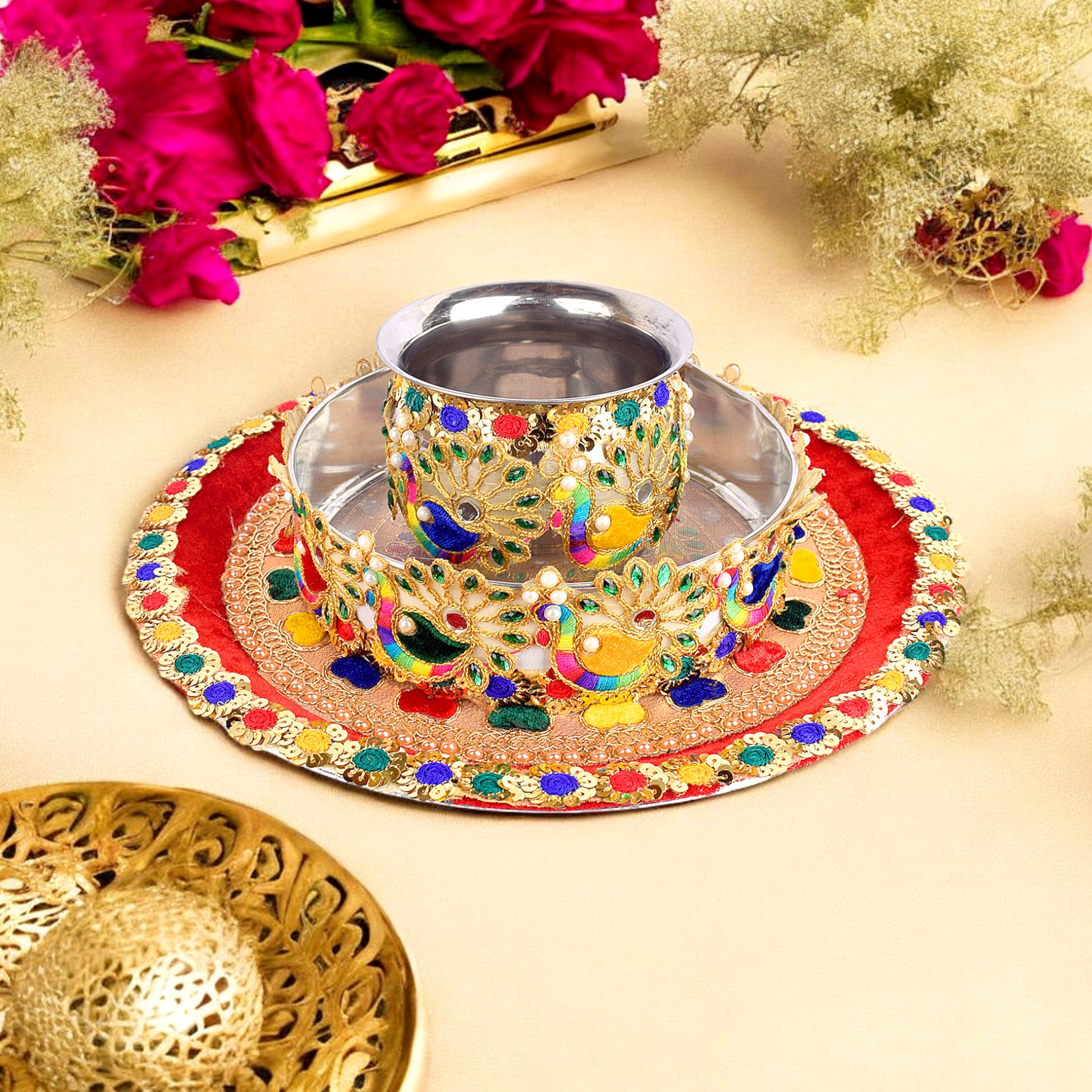 Item Name: Handcrafted Red and Gold  Karwa Chauth Thali Set-3pc