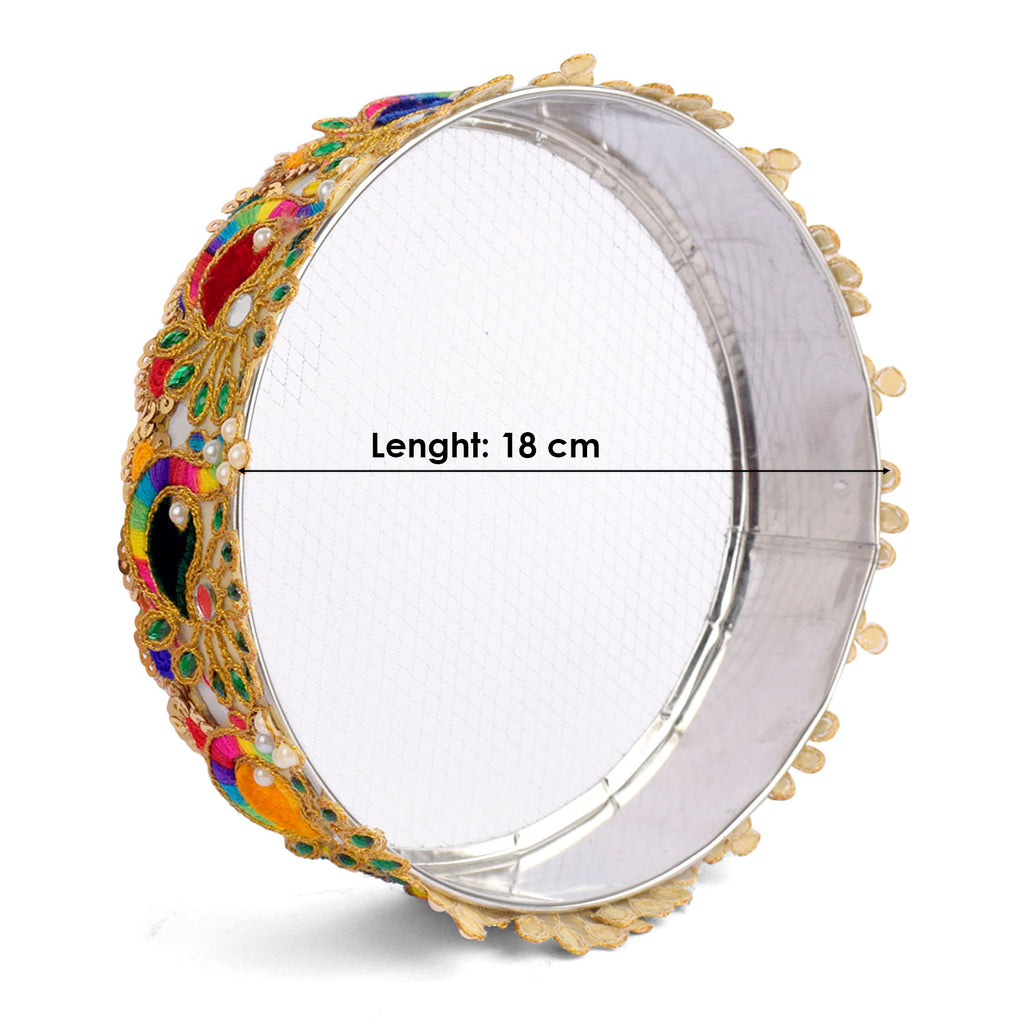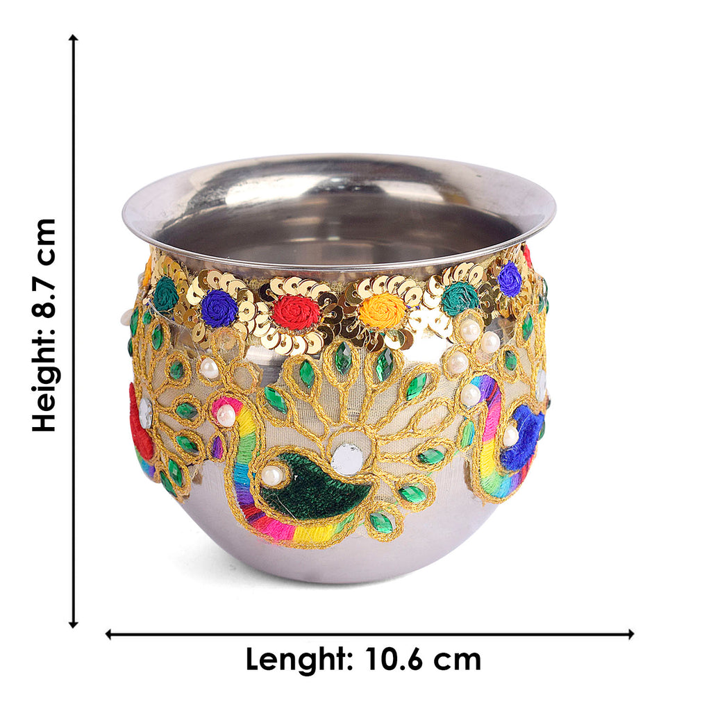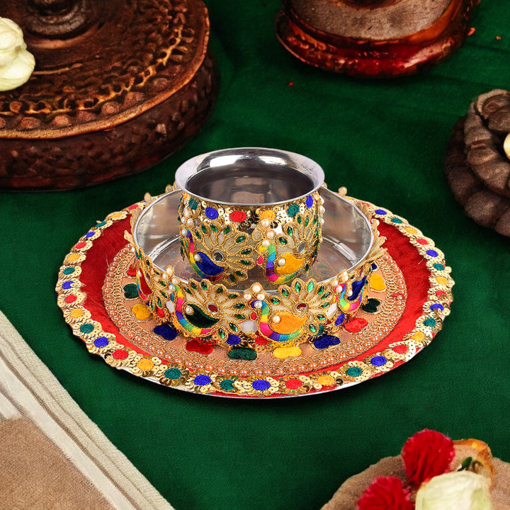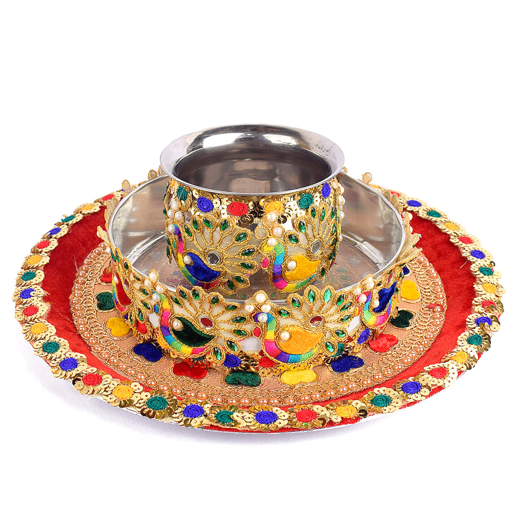 About Product: Karwa chauth beautiful Steel thali set includes a thali, Lota, Sieve for traditional and trendy way of karwa chauth pujan for all the married / engaged ladies and girls. Be attractive by using such a decorative piece of thali of puja for your love/ life. This thali can also be used on Diwali/ Deepawali Pujan. Karwa chauth thali set, karwa chauth thali, karwachauth thali platter, karvachauth thali platter, pooja thali set, steel puja thali set, complete karwachauth set, karwachouth set, designer thali set,hanmade thali set, Indian traditional set, karwachauth thali.