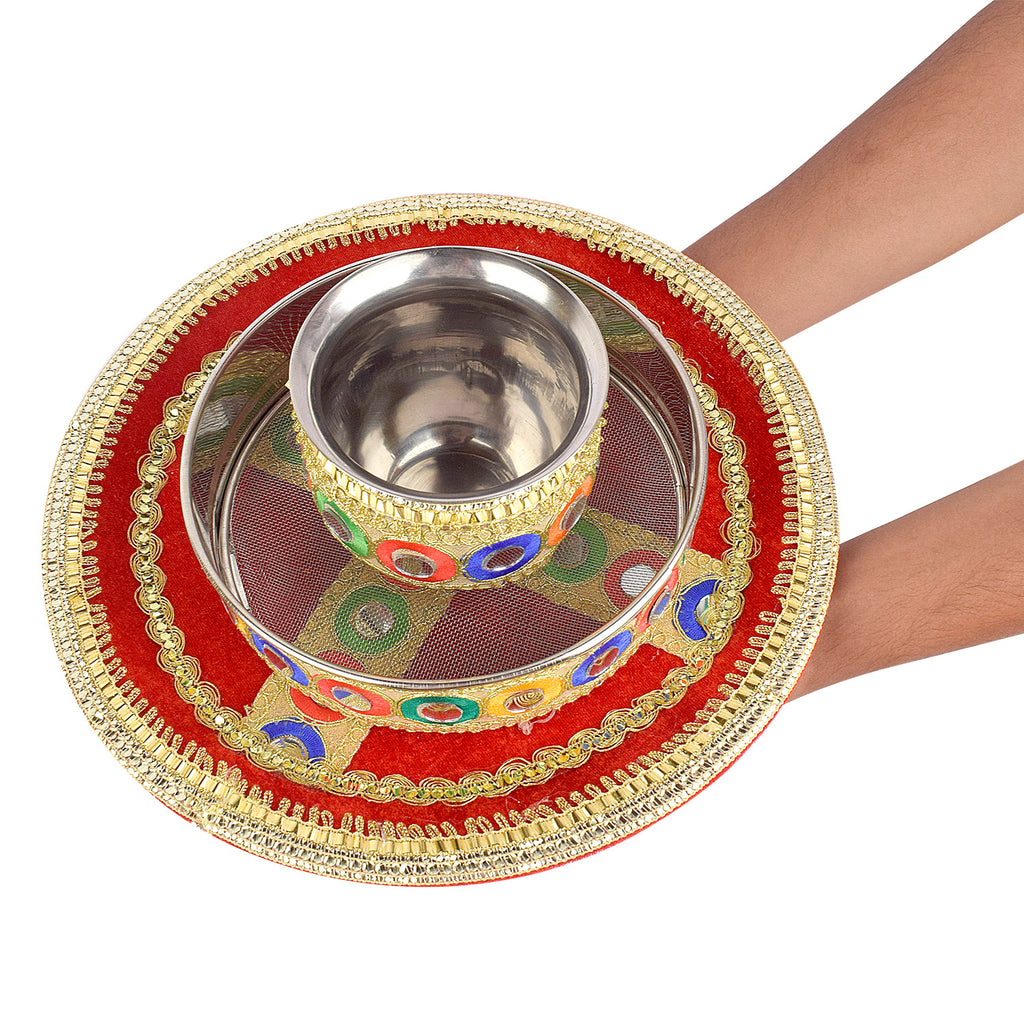Red Karwa Chauth Thali Set with Unique Design|Shopt at satvikstore.in