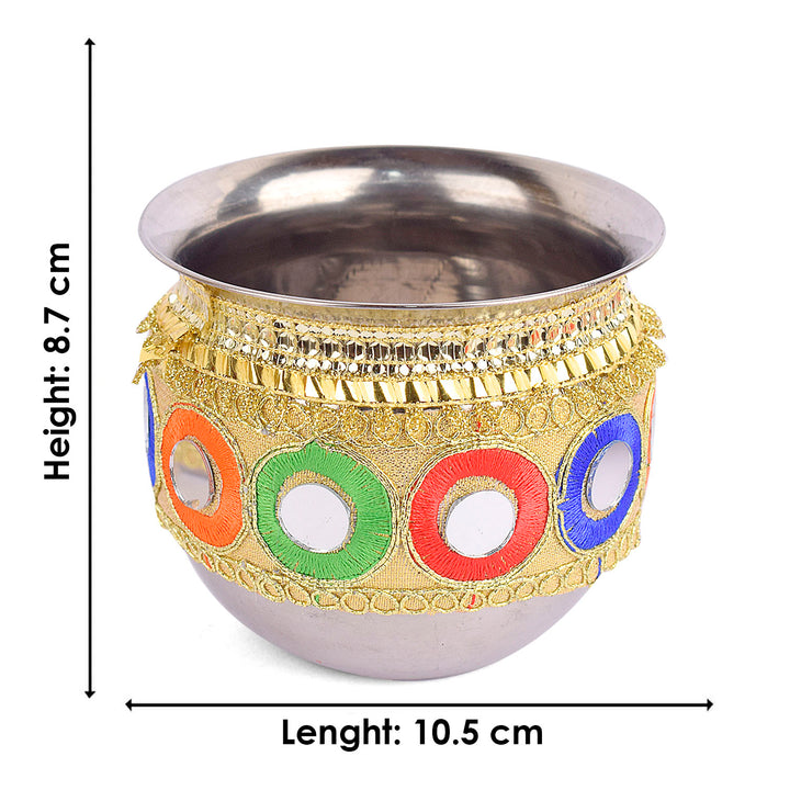 Design: Beautiful Handcrafted Designer Karwa Thali with Fabric all over the Thali and Lace Work all over the Lota and Sieve (Channi), Which makes it more Attractive.