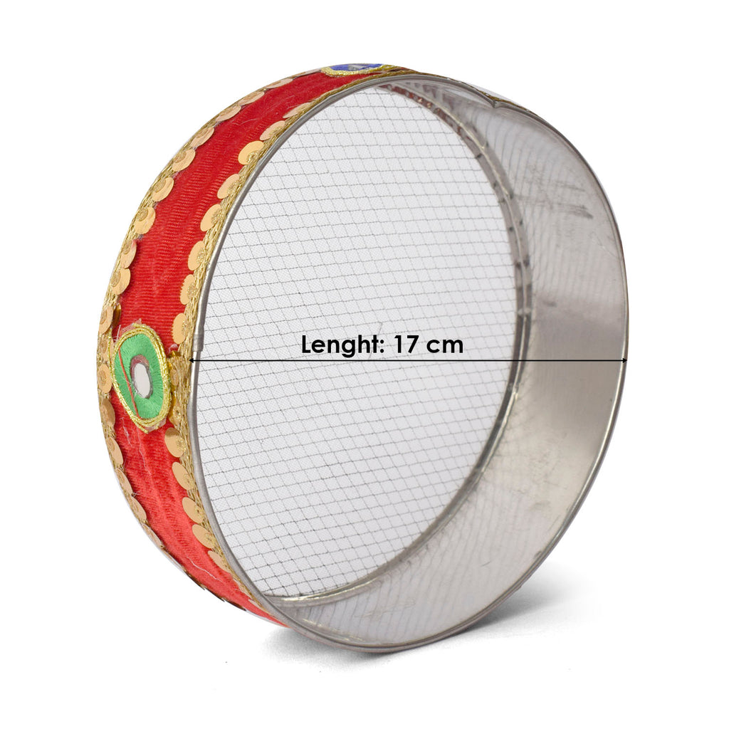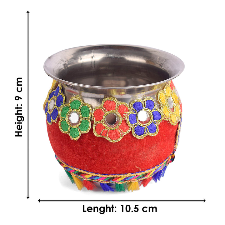 Design: Beautiful Handcrafted Designer Karwa Thali with Fabric all over the Thali and Lace Work all over the Lota and Sieve (Channi), Which makes it more Attractive.