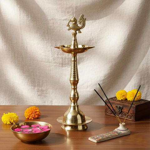 Discover the spiritual essence of South India with Kerala Nilavilakku, the most revered and iconic Kerala traditional lamp made from pure brass. At Satvikstore.in, we bring you an authentic selection of Kerala Nilavilakku online, including Peacock Diyas, Step Nilavilakku, and Kuthu Vilakku Kerala style lamps crafted for temples, homes, wedding ceremonies, and inauguration events.