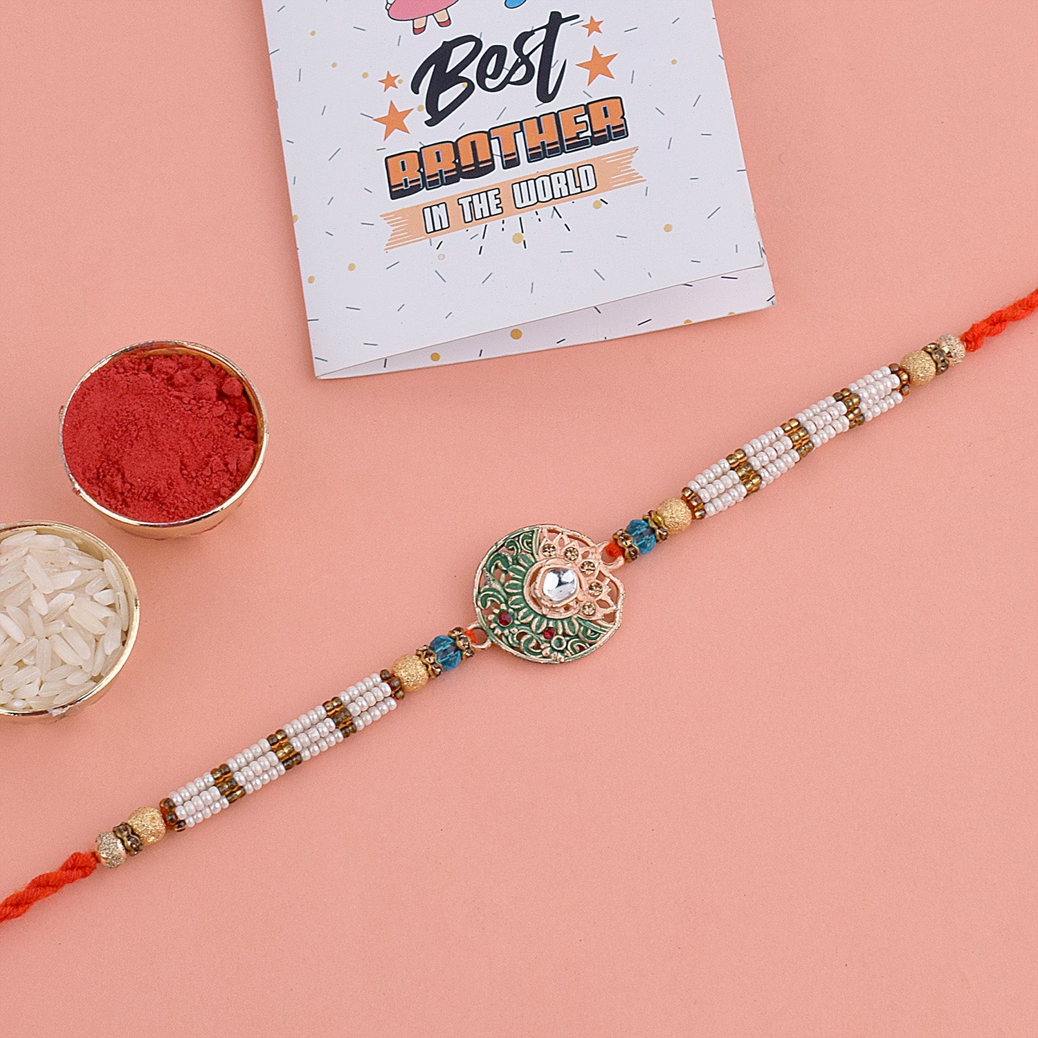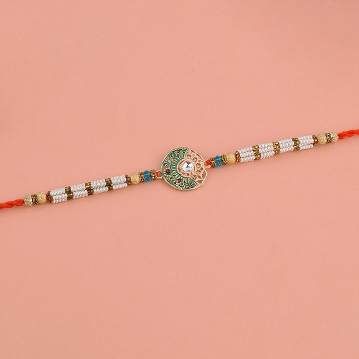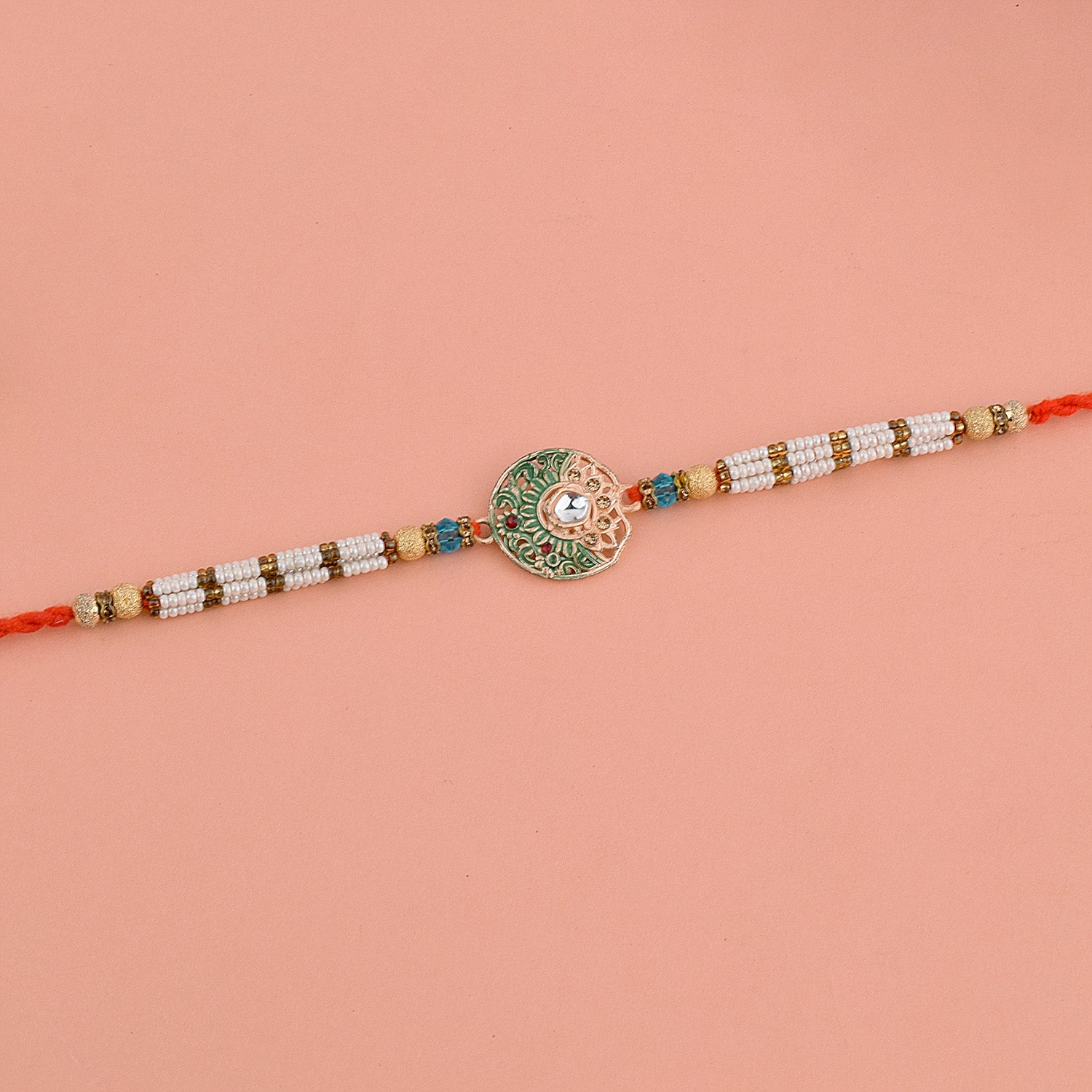 Beaded Rakhi: Adorned with intricate beads, our beaded rakhi collection exudes charm and elegance. Celebrate the joyous bond with your siblings as you tie these vibrant and delightful rakhis on their wrists.