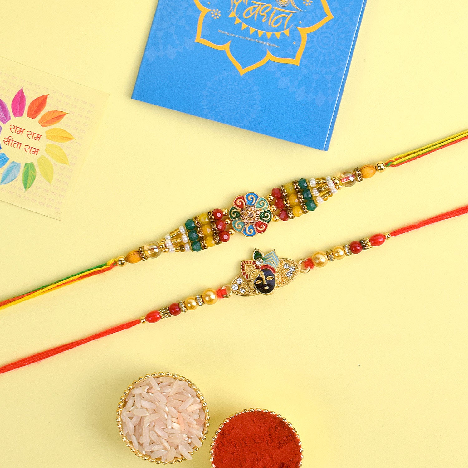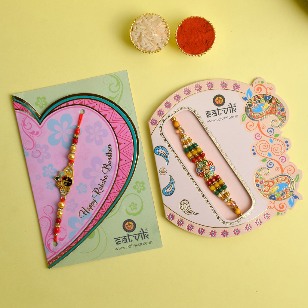Beaded Bhaiya Rakhi Set of 2: Bedecked with colorful beads, these rakhis represent the joyous moments and cherished memories of growing up together. Embrace nostalgia and affection with this delightful beaded rakhi set.
