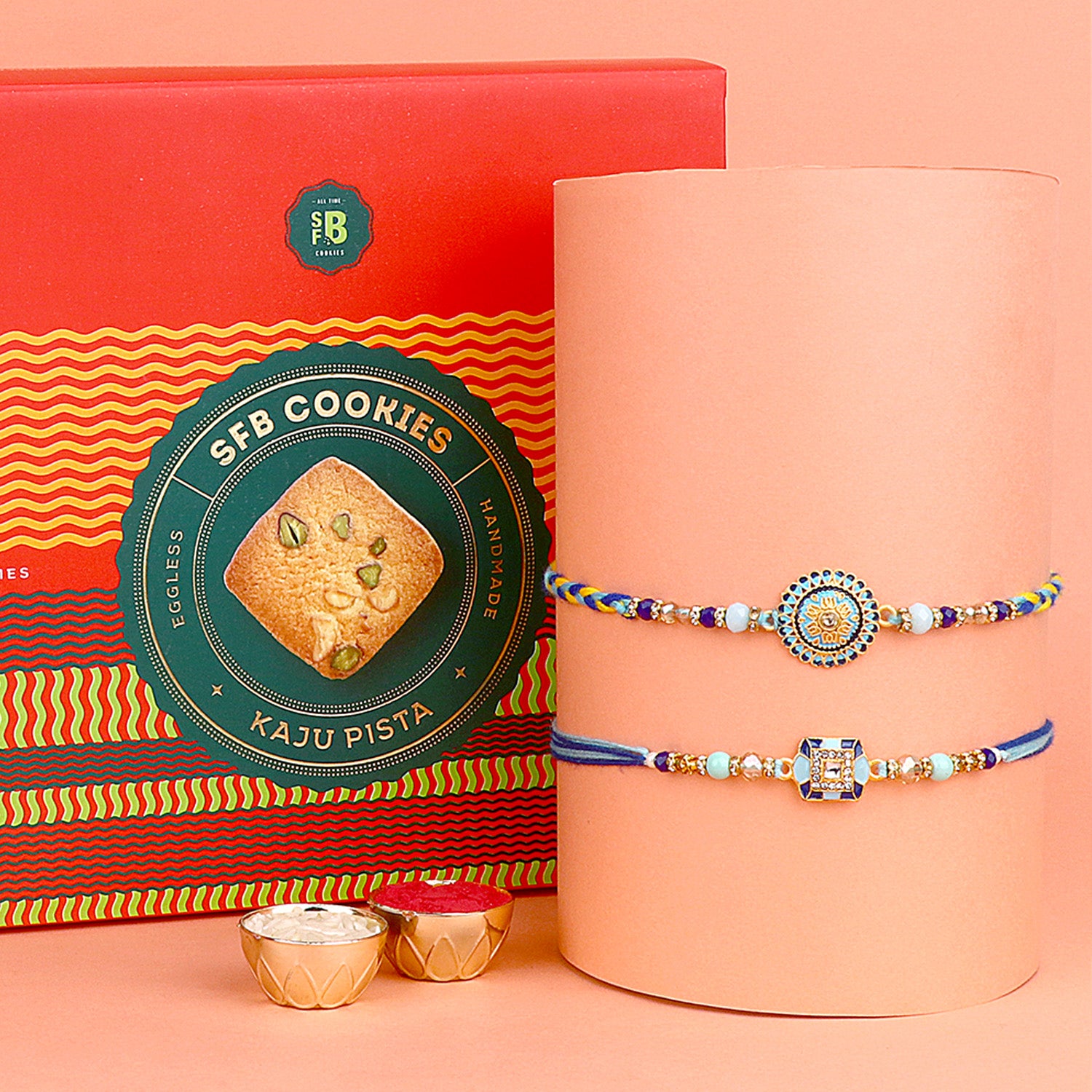 • Package: Set of 2 Bhaiya Rakhi, 1 Greeting card, 1 Roli Chawal Bottle, 1 Cookies Pack