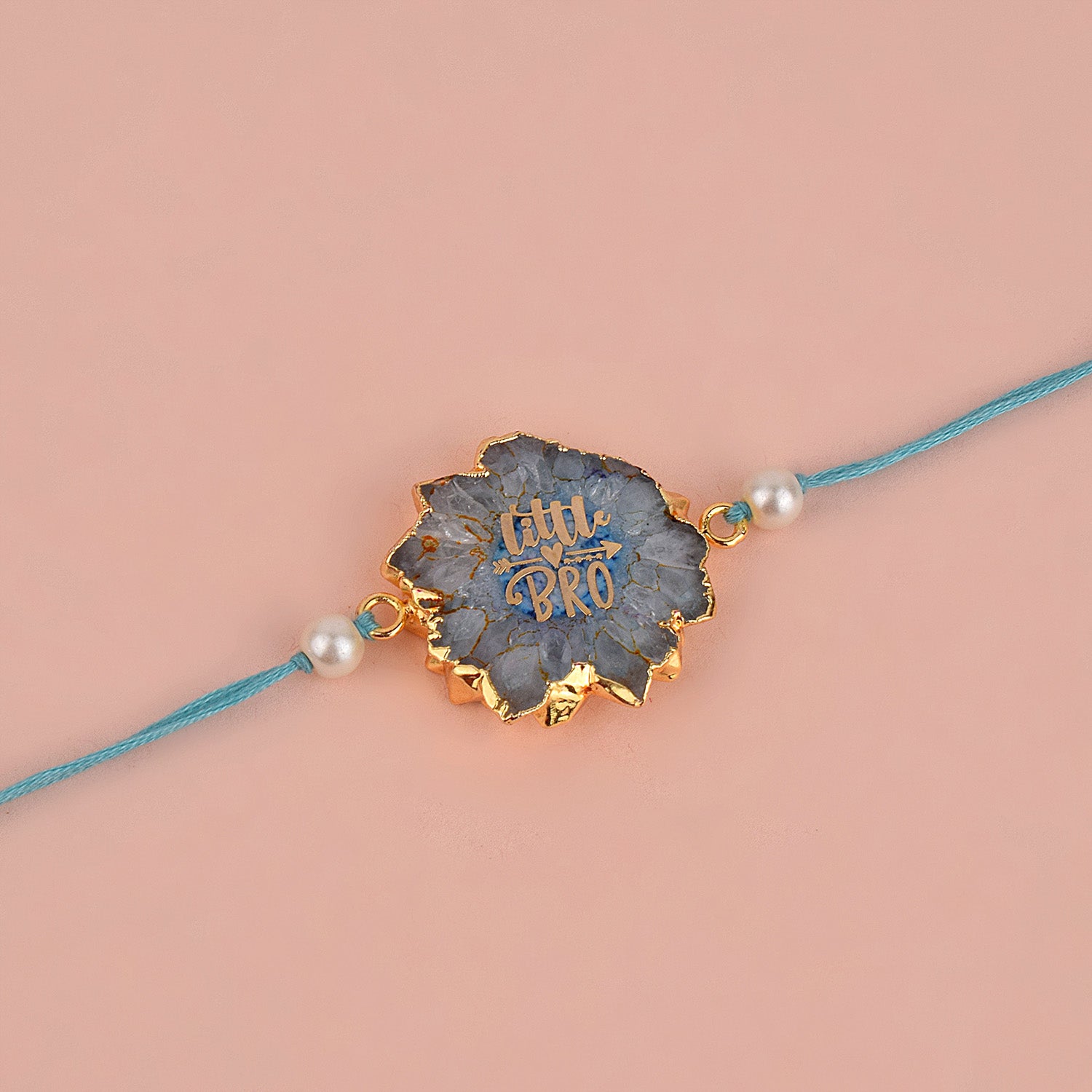 • About ProductThe "Genuine Agate Gemstone Little Bro Rakhi" is a delightful and precious rakhi specially designed to celebrate the affectionate bond between an elder sibling and their little brother. This rakhi is a symbol of love, protection, and admiration, incorporating the timeless beauty of Agate gemstone, which enhances its significance as a cherished token for Raksha Bandhan.