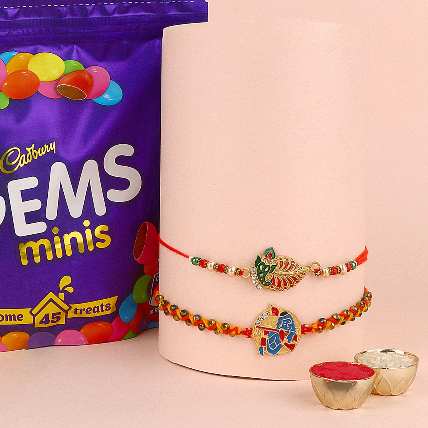 Meenakari Rakhi Set of 2: Adorned with intricate Meenakari work, these rakhis exude the essence of cultural heritage and artistic finesse. The vibrant colors and delicate patterns make these rakhis a true celebration of sibling love.