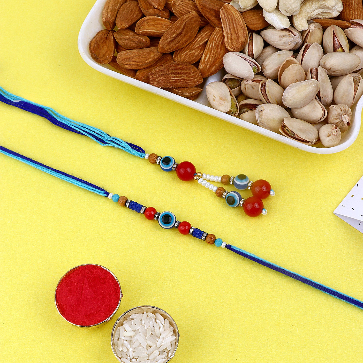 Beaded Bhaiya Rakhi Set of 2: Bedecked with colorful beads, these rakhis represent the joyous moments and cherished memories of growing up together. Embrace nostalgia and affection with this delightful beaded rakhi set.