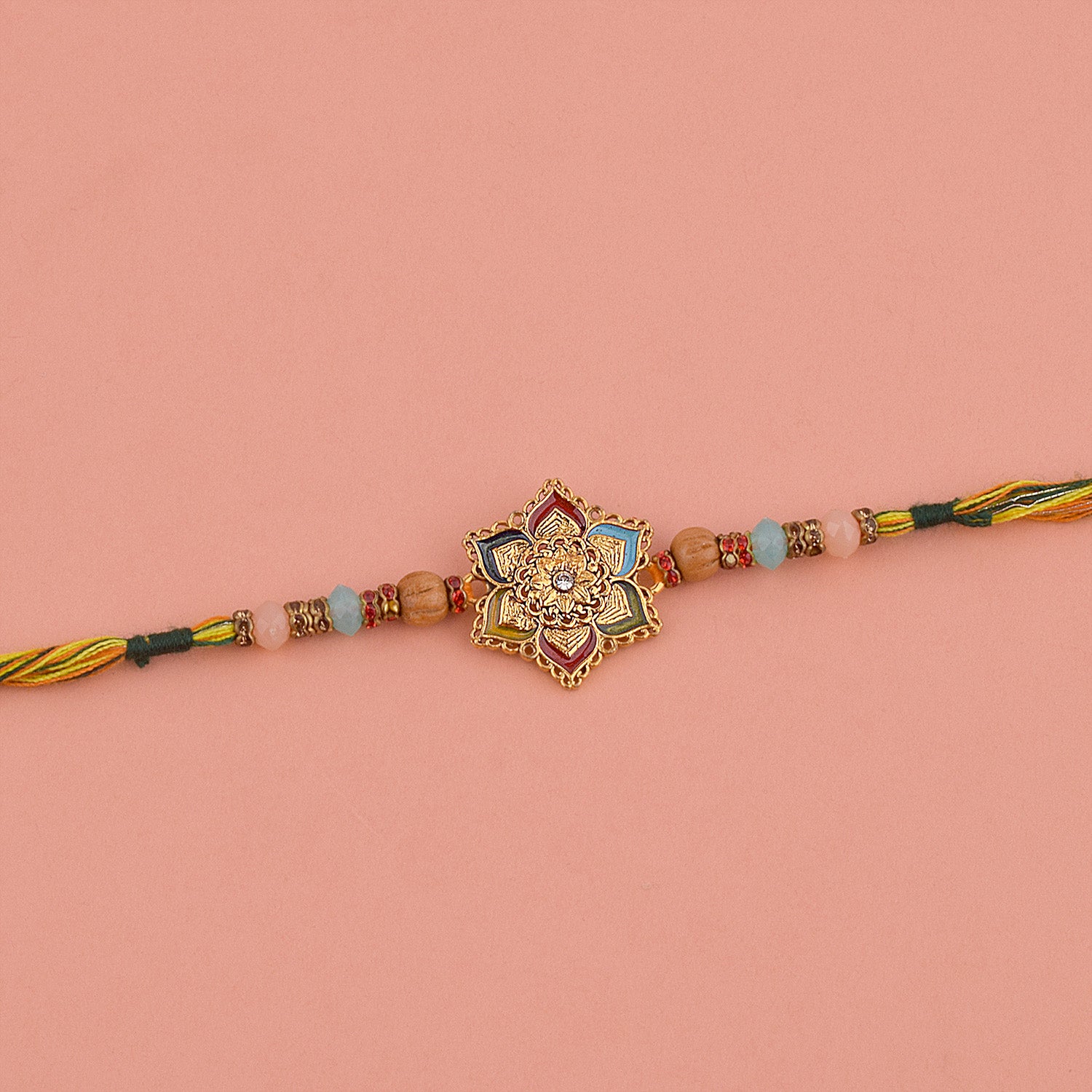 Beaded Rakhi: Adorned with intricate beads, our beaded rakhi collection exudes charm and elegance. Celebrate the joyous bond with your siblings as you tie these vibrant and delightful rakhis on their wrists.