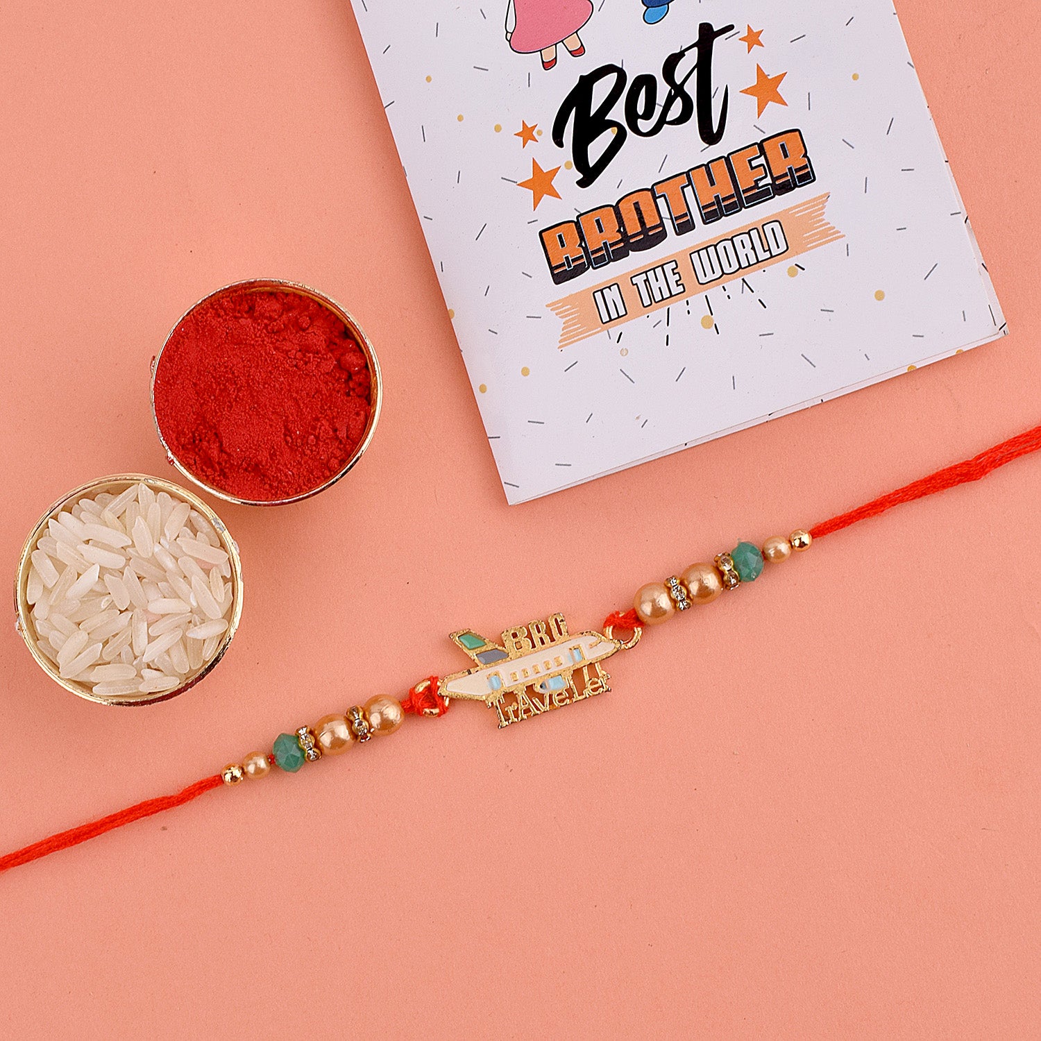 • Package:Β 1 Pc Rakhi, roli akshat and greeting card