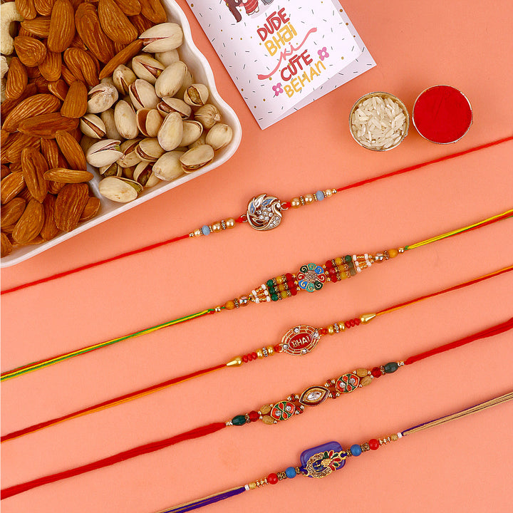 Beaded Bhaiya Rakhi Set of 2: Bedecked with colorful beads, these rakhis represent the joyous moments and cherished memories of growing up together. Embrace nostalgia and affection with this delightful beaded rakhi set.