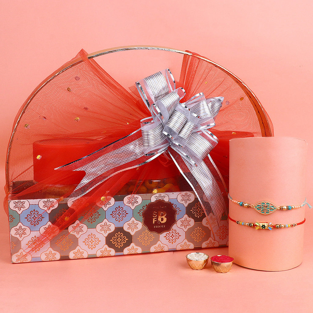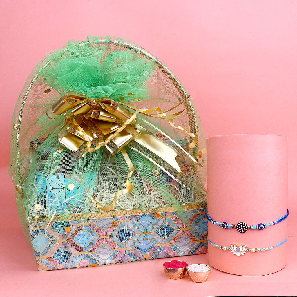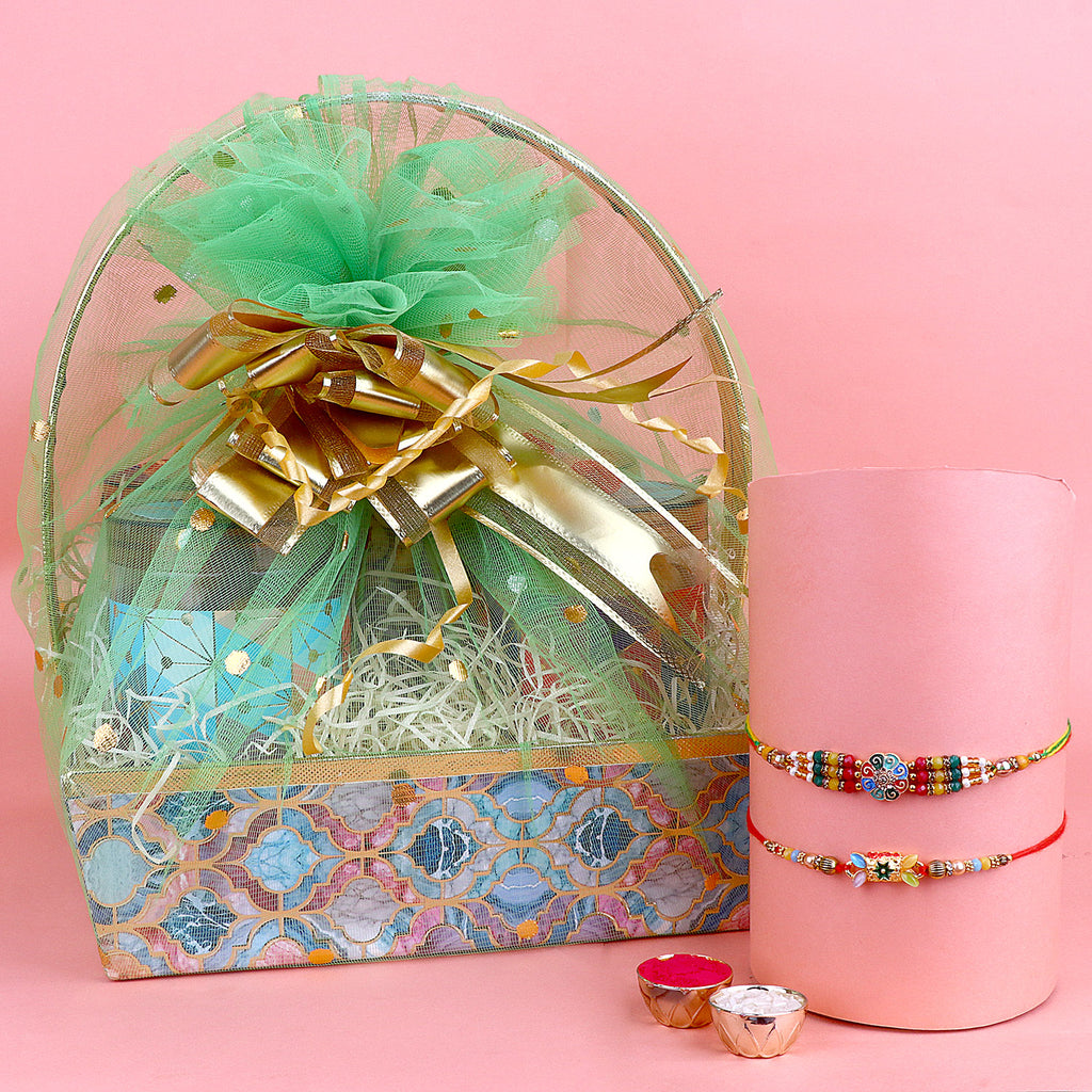 Accompanying the Rakhi is a thoughtfully curated gift hamper, designed to delight your dear Bhaiya with a selection of his favorite treats, chocolates, or thoughtful keepsakes. The hamper is carefully packed, ensuring that every element is of the finest quality and chosen with love, making it a truly heartwarming gift.