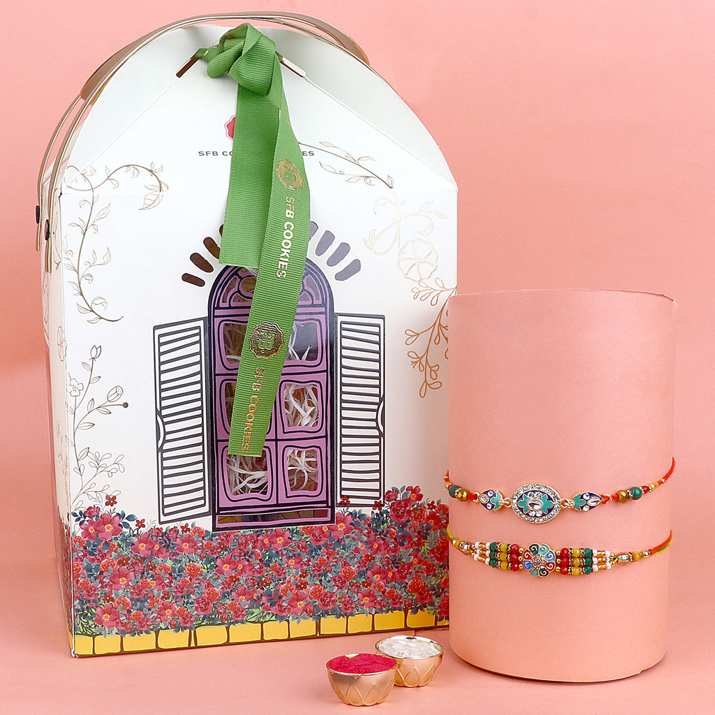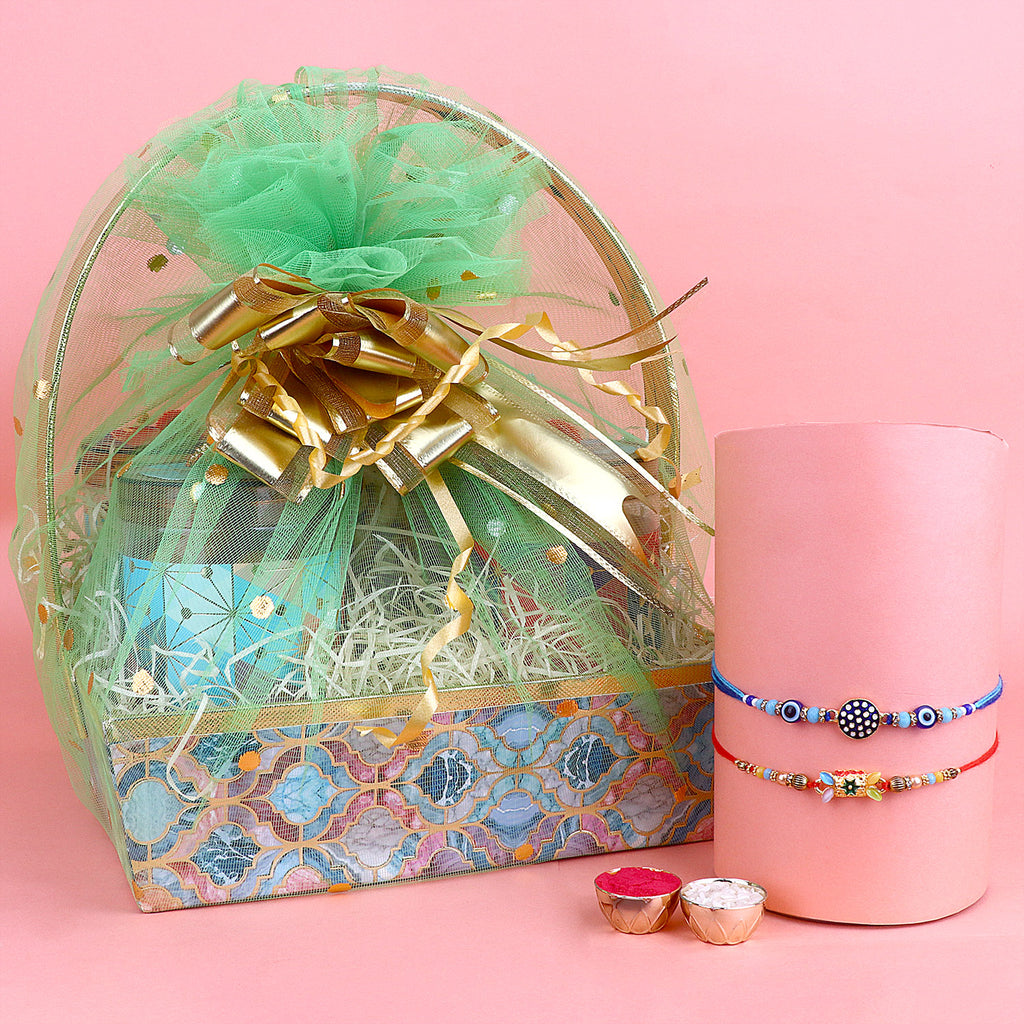 Our Bhaiya Rakhi with Gift Hamper is a delightful combination that includes a beautifully handcrafted Rakhi, lovingly designed to symbolize the bond between siblings, along with an assorted gift hamper packed with goodies and tokens of affection. This exclusive Rakhi hamper is a perfect way to shower your brother with love and blessings on this auspicious day.