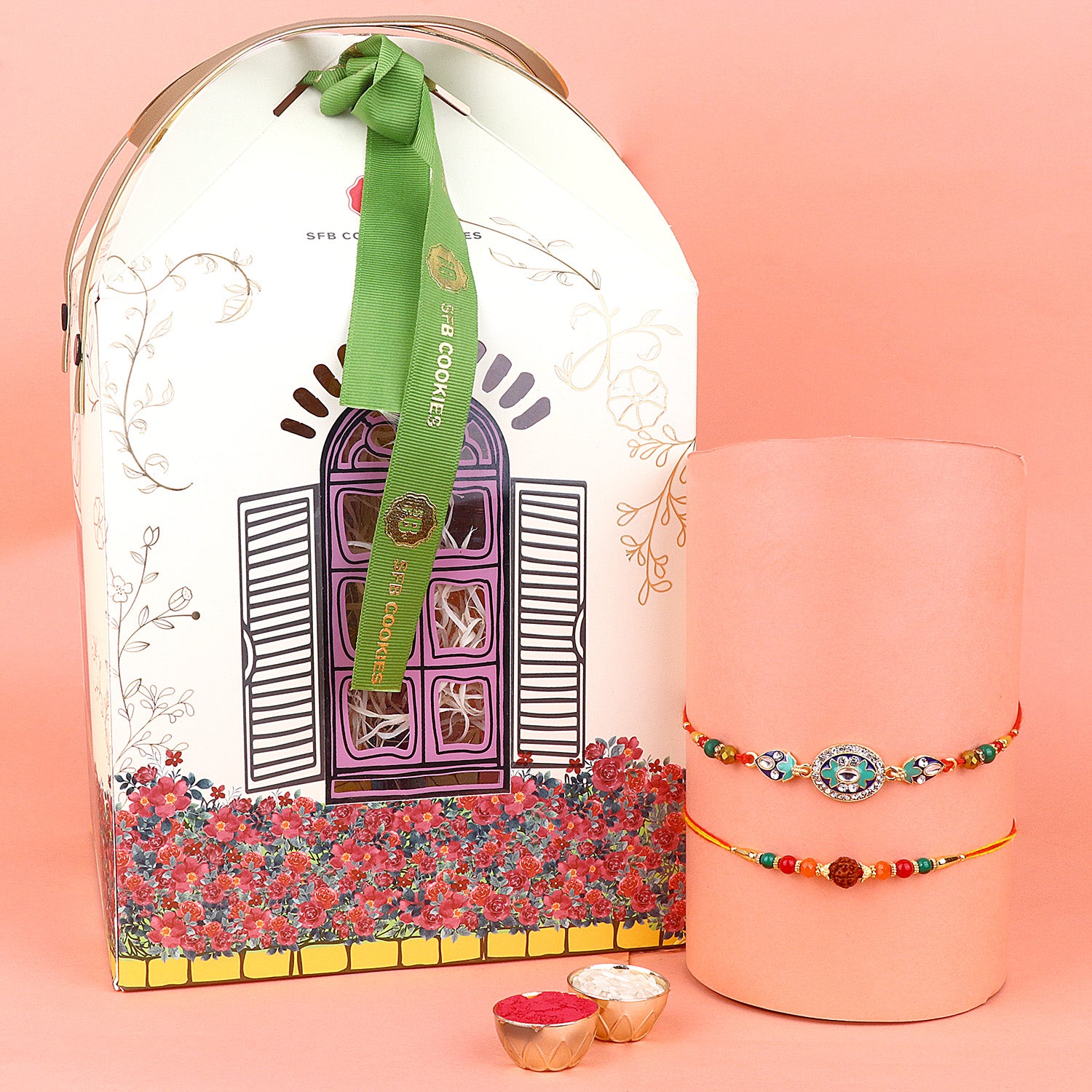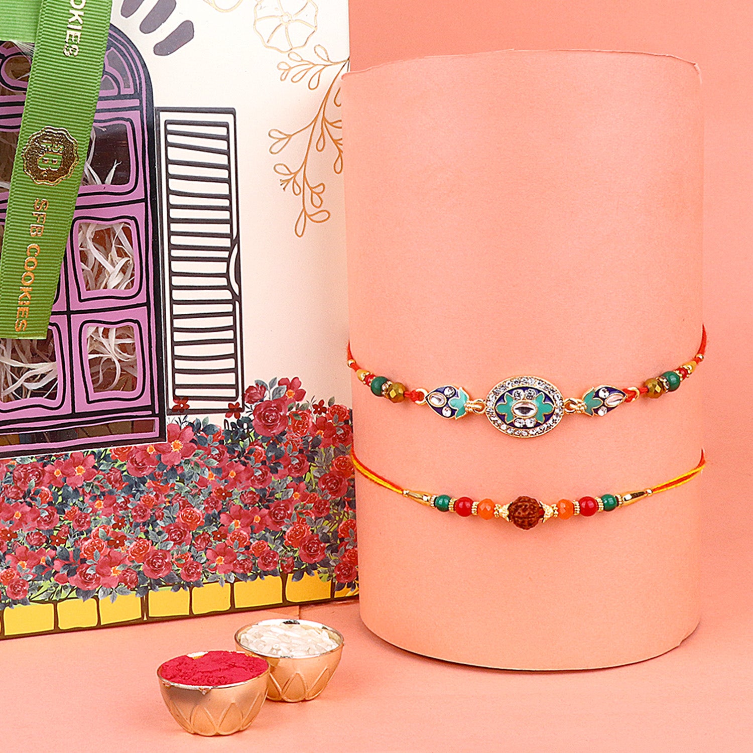 Our Bhaiya Rakhi with Gift Hamper is a delightful combination that includes a beautifully handcrafted Rakhi, lovingly designed to symbolize the bond between siblings, along with an assorted gift hamper packed with goodies and tokens of affection. This exclusive Rakhi hamper is a perfect way to shower your brother with love and blessings on this auspicious day.