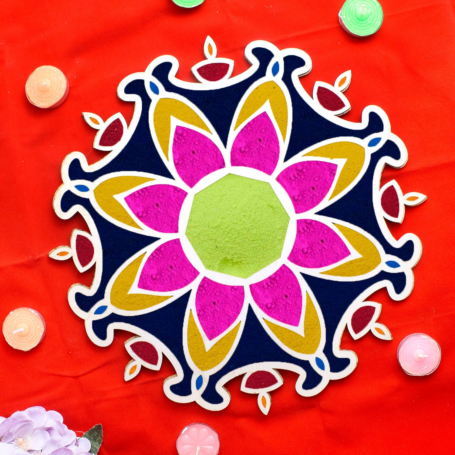 Crafted with precision, the reusable MDF (Medium-Density Fiberboard) Rangoli Mat serves as a sturdy canvas for your creative expression. Its wooden base provides stability, making it easy to position and design your Rangoli with precision. This dynamic duo ensures that even beginners can craft intricate and visually appealing Rangoli patterns.